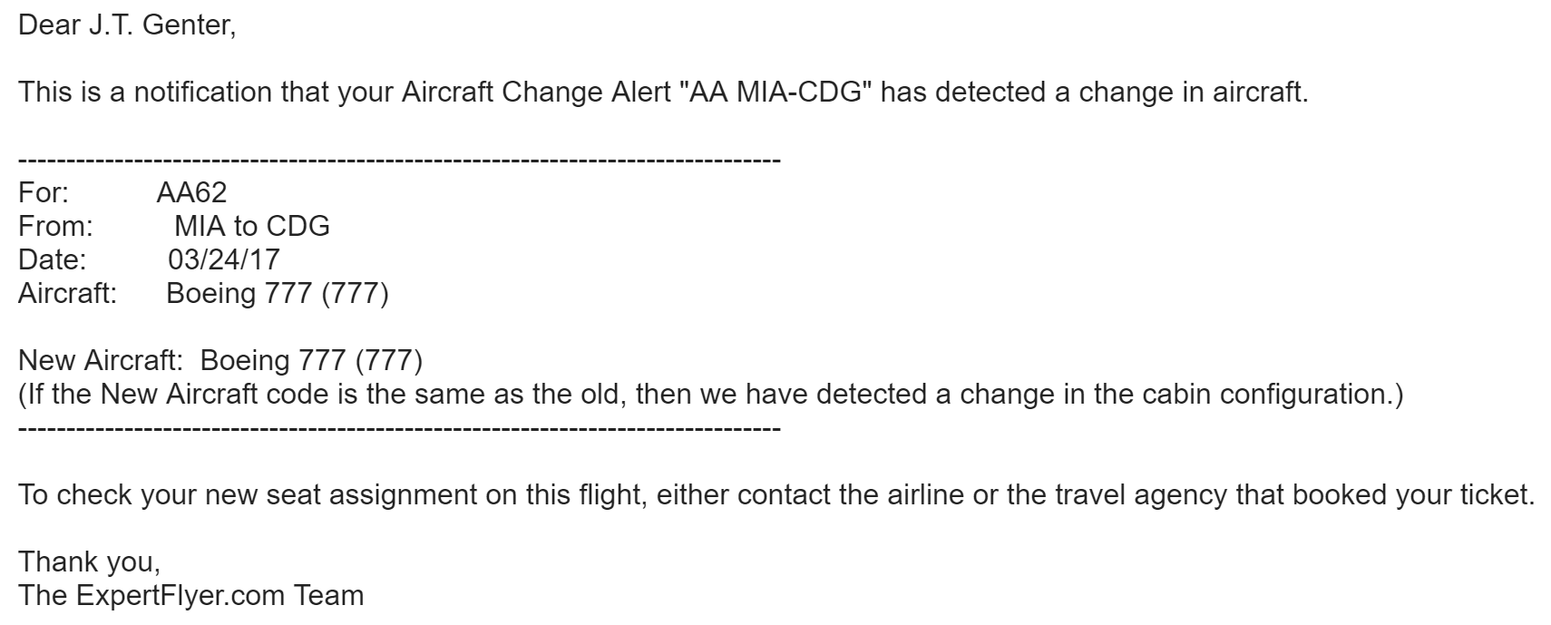 In terms of how to avoid this the next time around, the answer is simple: ExpertFlyer Aircraft Change Alerts. I have found it incredibly helpful to set aircraft change alerts for all of my flights, especially on American Airlines — which is known for its last-minute aircraft changes.