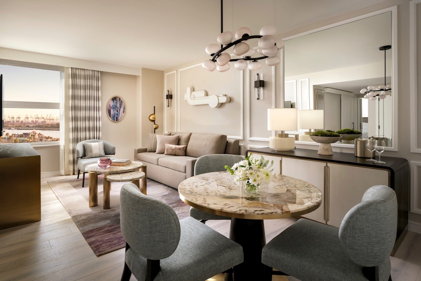 The hotel features 185 accommodations, including 22 suites. In true Fairmont form, guests can expect luxe Le Labo amenities along with stunning views of either Long Beach harbor or the palm tree-lined downtown area. The hotel's renovation is meant to provide both a coastal color palette and a mix of modern furnishings with nods to the past. Original plaster moldings, exterior ornamentation and even the lobby mailbox have been restored to their original 1920s fabulosity.