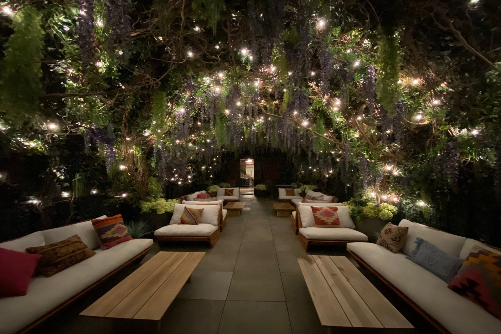 The two turret suites share the outdoor space, so when both rooms are occupied, a large wall of fake flowers is added to split it down the middle and provide some privacy. The area can also be opened up for weddings and other events if the hosts book both suites.