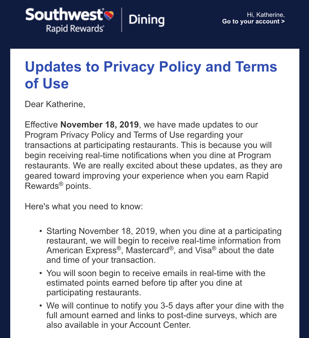 If you utilize an airline-sponsored dining program to earn miles for dining out, you may have received an email similar to this one that landed in my inbox this morning.