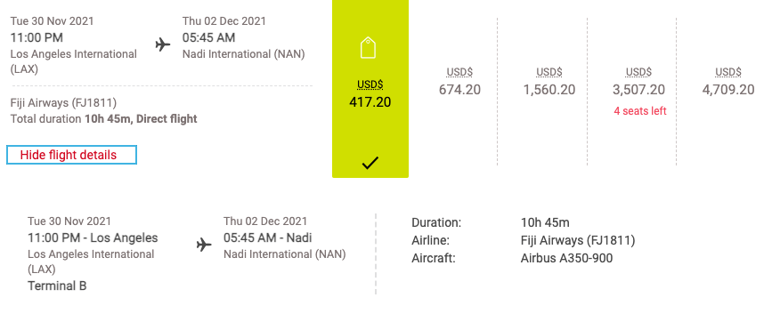 I also found Fiji-operated flights on American Airlines, where round-trip flights from LAX November through March can be had for around $1,400 for the main cabin, increasing to $4,500 in business class. AA-ticketed flights would cost you 80,000 AAdvantage miles and 160,000 miles, respectively, round-trip.
