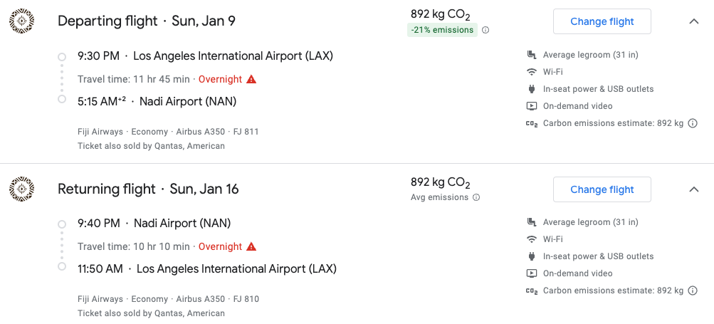 Based on a test search, nonstop direct flights from LAX to NAN can be found as low as $900 through April 2022, for fares in its economy class for its Special fares, which also include its Bula Saver fare. Both classes include a meal, one checked bag and a carry-on bag. Although tickets can be changed for a fee, they are nonrefundable.