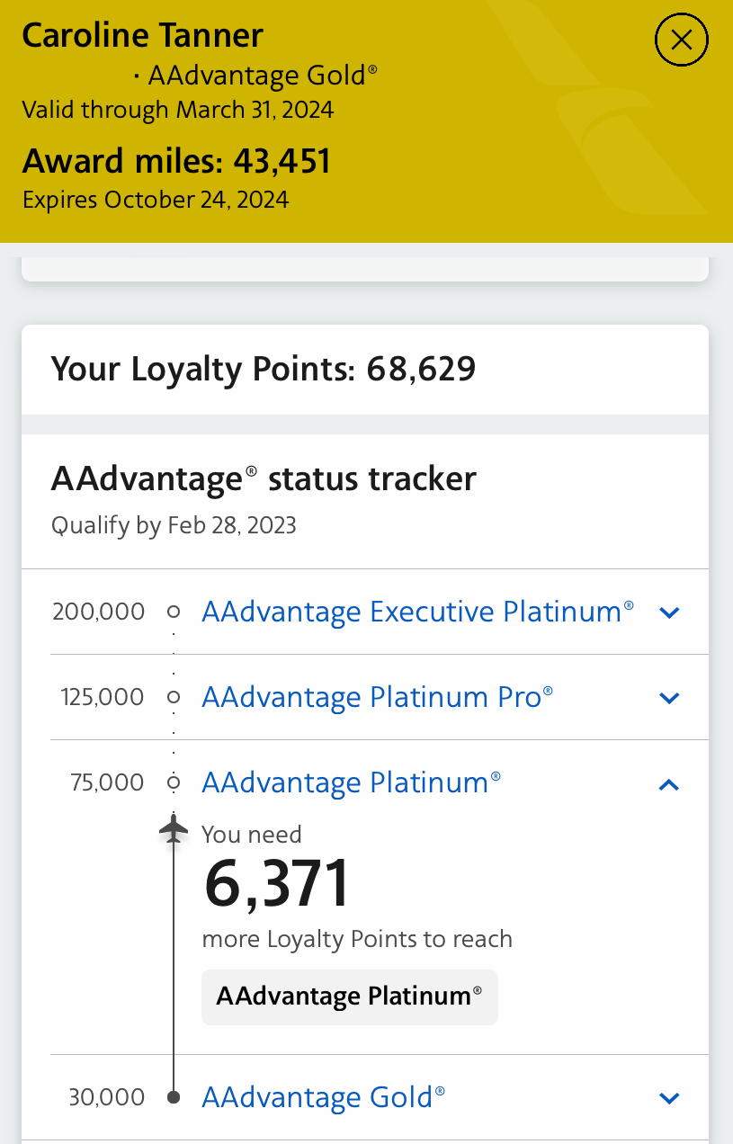 Thanks to this trip, I now have nearly 69,000 Loyalty Points, just 6,371 points short of Platinum status for 2023. This year, I have until the end of February to get Platinum since the qualification period runs from March 1, 2022, through February 2023.