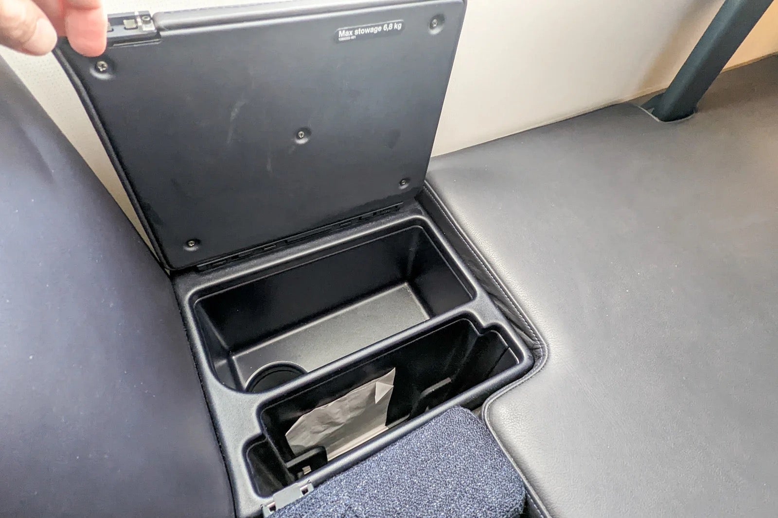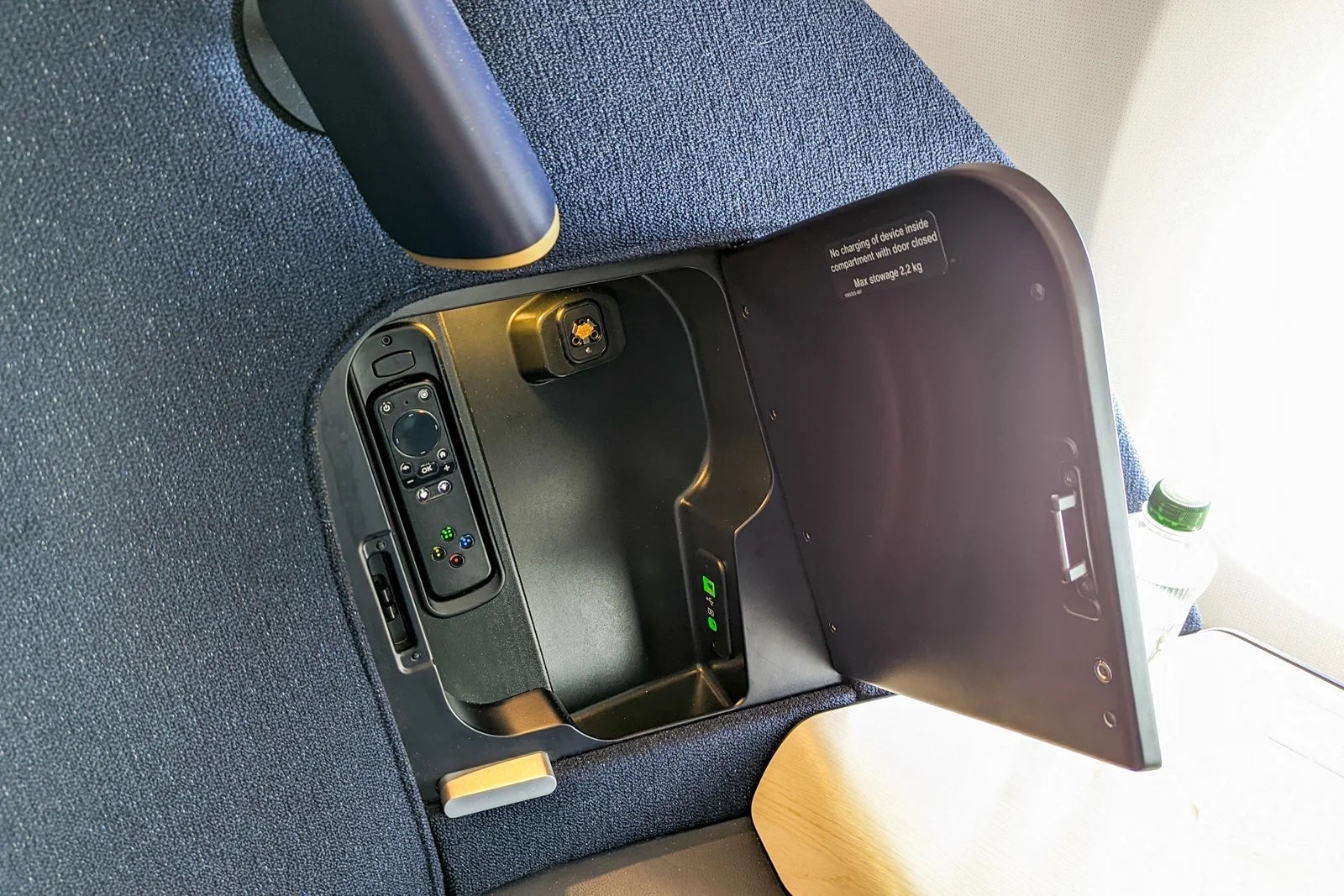 The storage in the AirLounge seat is what you would expect from a leading product. There is a compartment next to your torso where the remote control and charging plugs are found, another small bin under the window and a small shelf under the footrest for a pair of shoes.