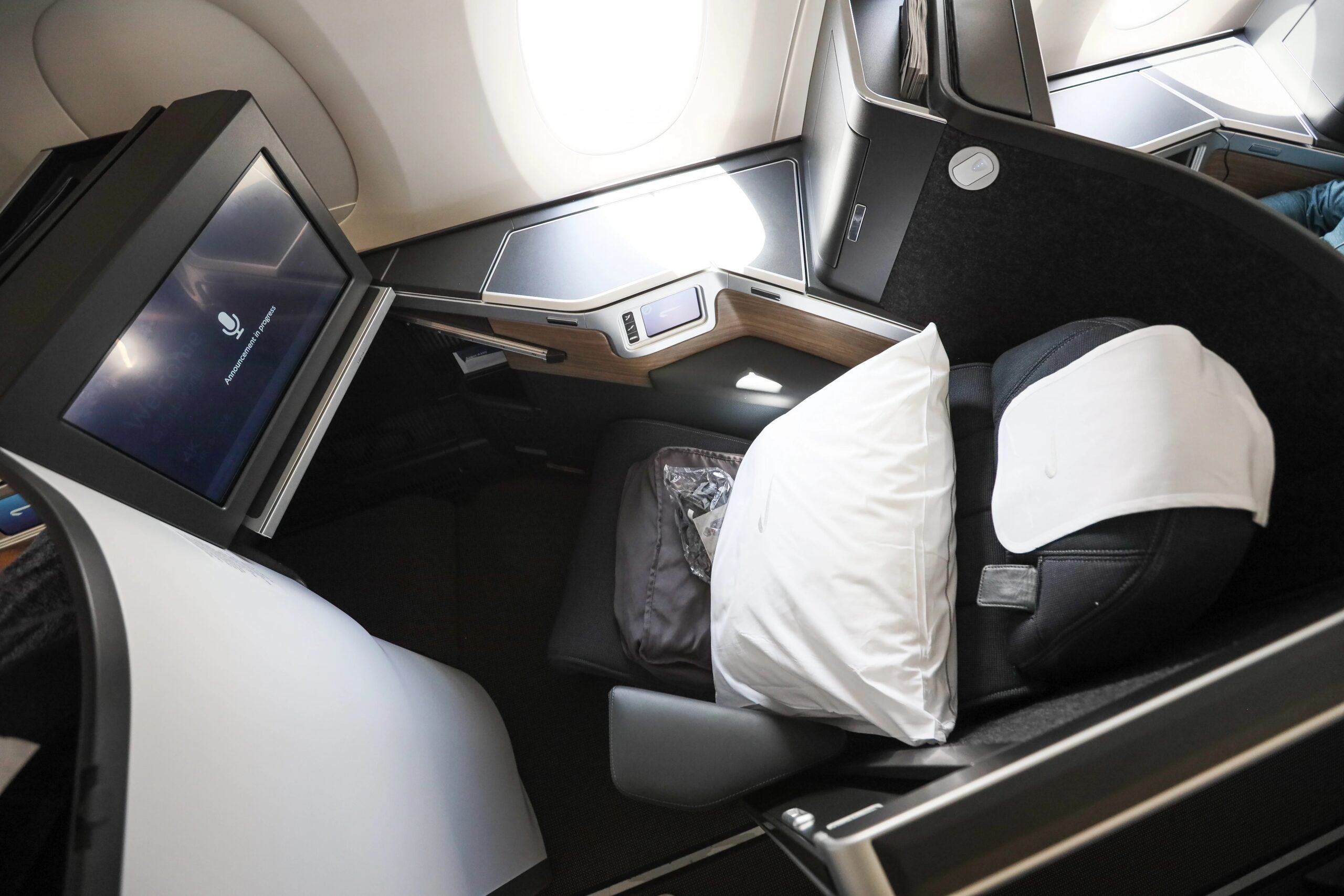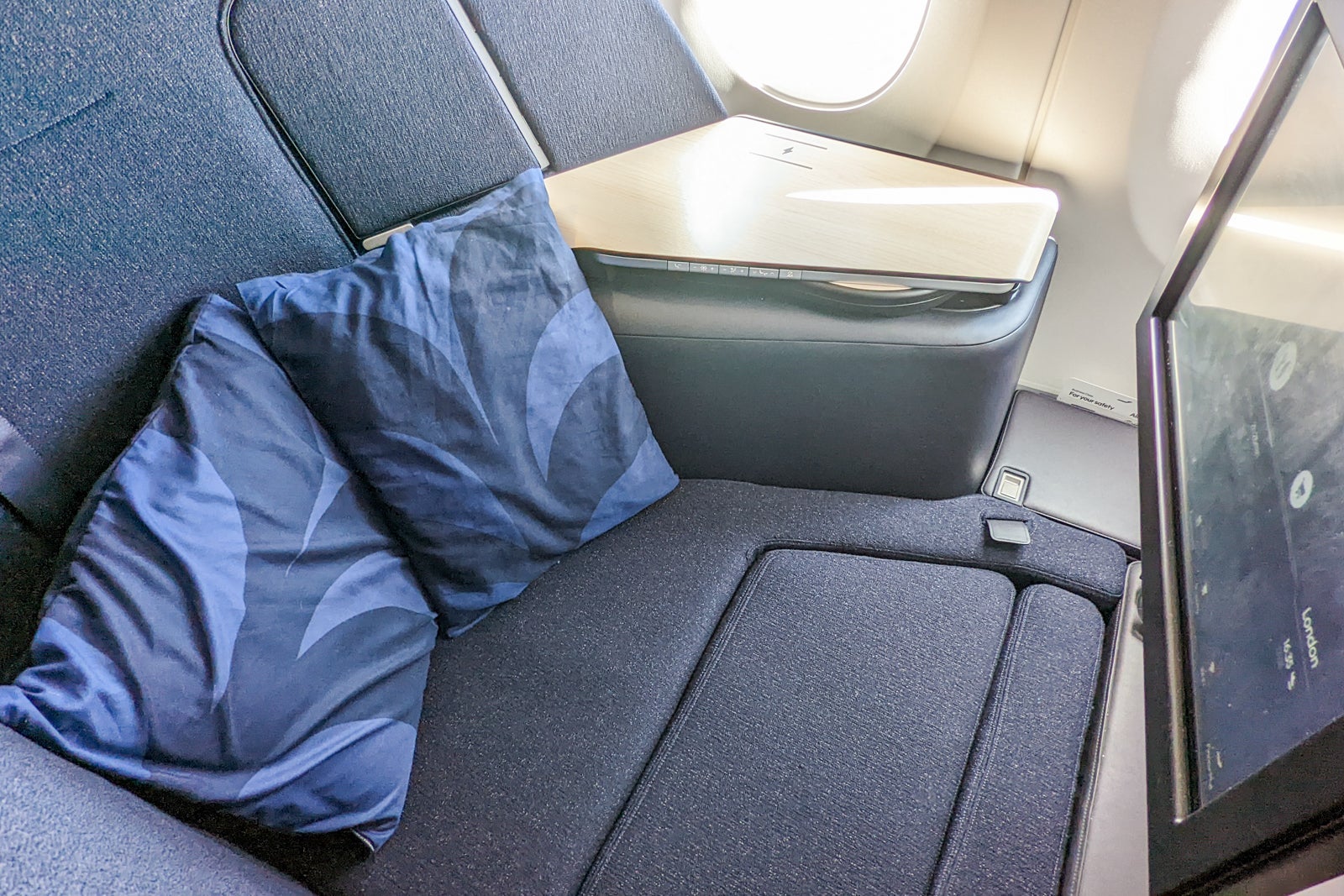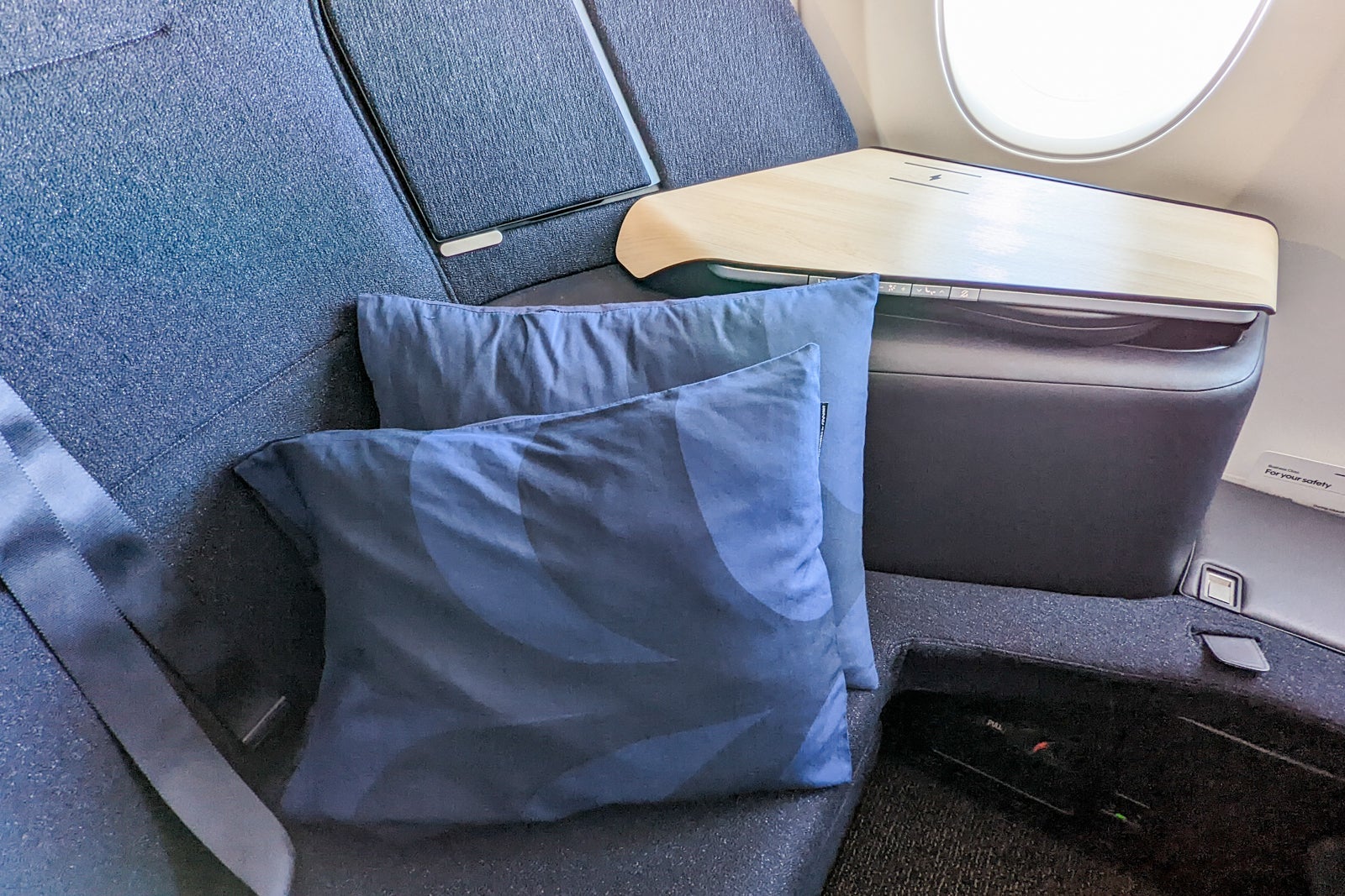 Two plush cushions were awaiting me — one that was more of a traditional pillow for sleeping and another that was like a throw pillow. These were supposed to compensate for the lack of recline in this unique seat.