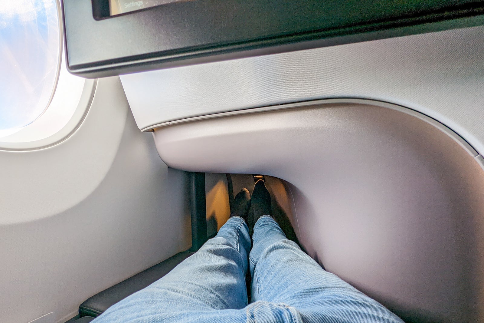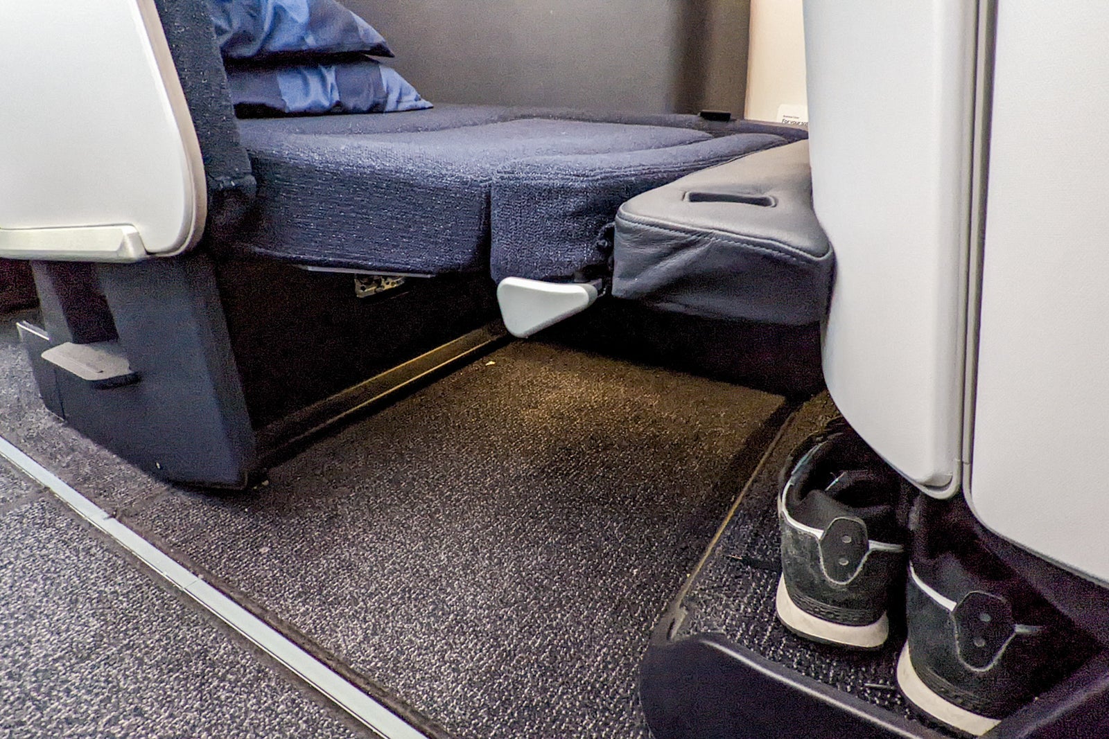 I'm six feet tall, and there was plenty of space to lie down and stretch out. This is one of the only business-class seats I have been in where my toes did not touch the seat at the end of the footwell in front.