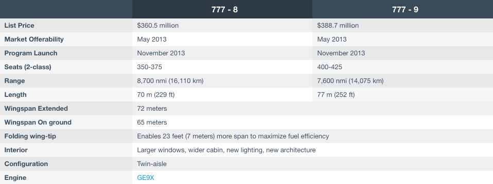 There will be two models — the longer-range 777-8, capable of flying just over 10,000 miles without a stop, and the larger 777-9, with seating for up to 425, depending on the configuration.