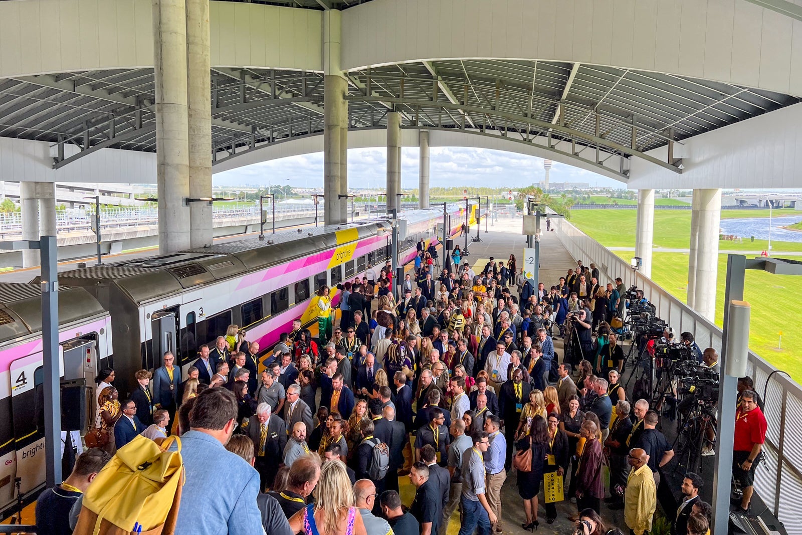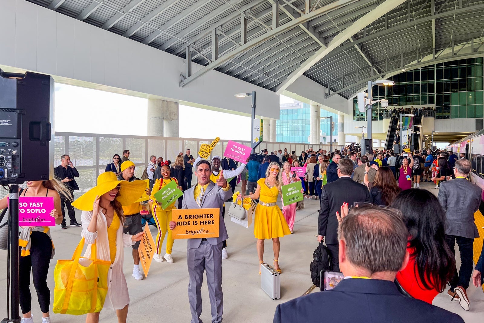 The atmosphere on board exploded into outright celebration as we stepped onto the platform. A massive welcoming committee was on hand to greet the train, including Orlando Mayor Buddy Dyer, various Brightline executives and the cheer squad from the University of Central Florida.