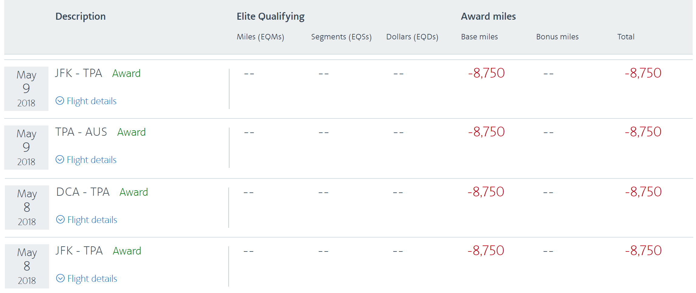 Just last weekend, I flew from New York's Kennedy (JFK) to Tampa (TPA) — a reduced mileage award eligible destination — for 8,750 miles one-way. Sure, I could have flown through Charlotte (CLT) and gotten an Airbus A319 business class with recliner seats, but I took an extra hour to fly through Miami (MIA) instead. That way, I got to fly the Brian Kelly Express from JFK-MIA, and then enjoyed the American Express Centurion Lounge in MIA thanks to my Platinum Card® from American Express.