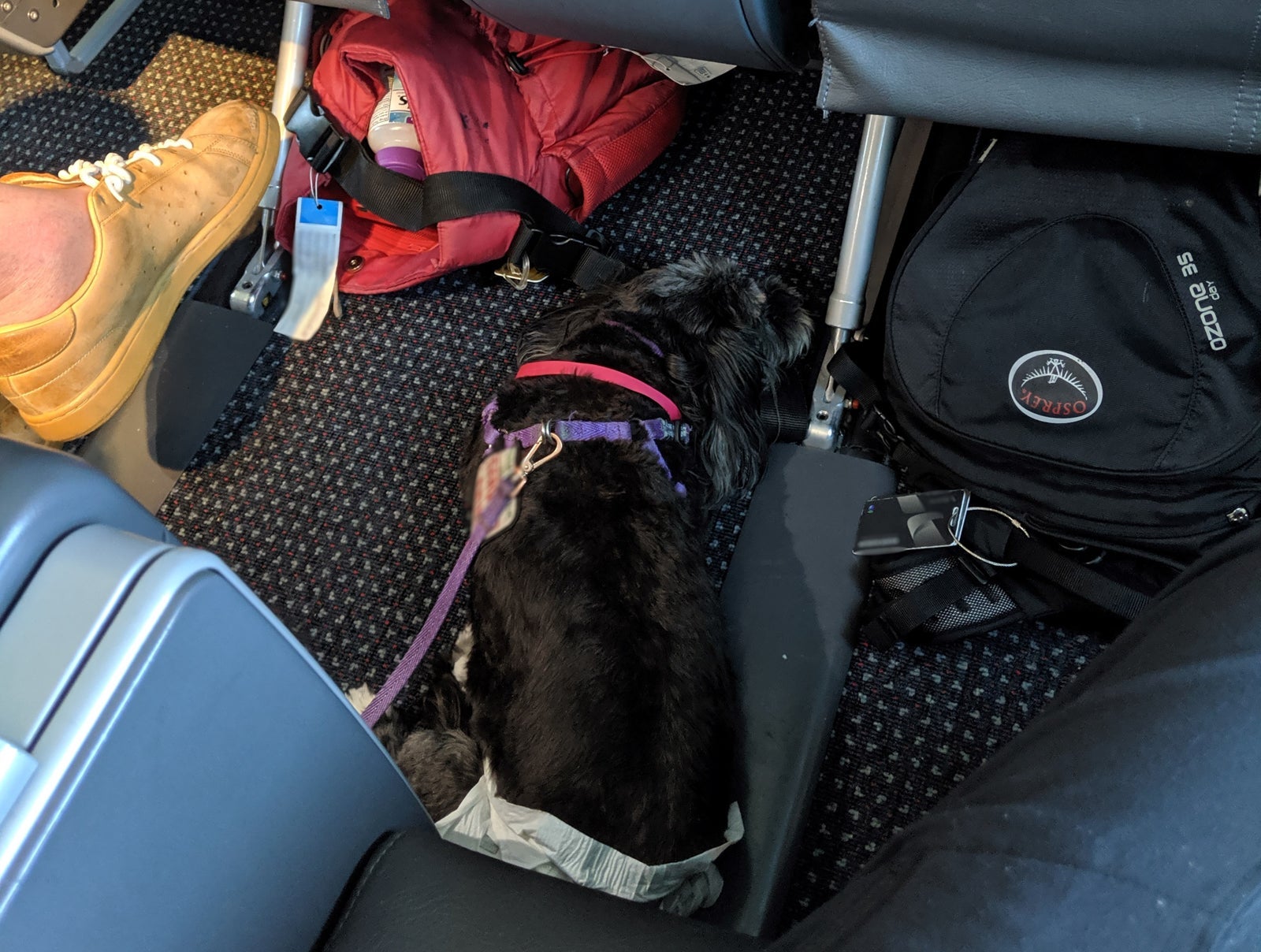 Based on its harness, the dog seemed to be traveling as an emotional support animal. The dog laid on the floor between our seats for the first half of the flight, which meant I had to be careful when I moved my legs or got items from my bag. The man held the dog in his lap for the second half of the short flight.