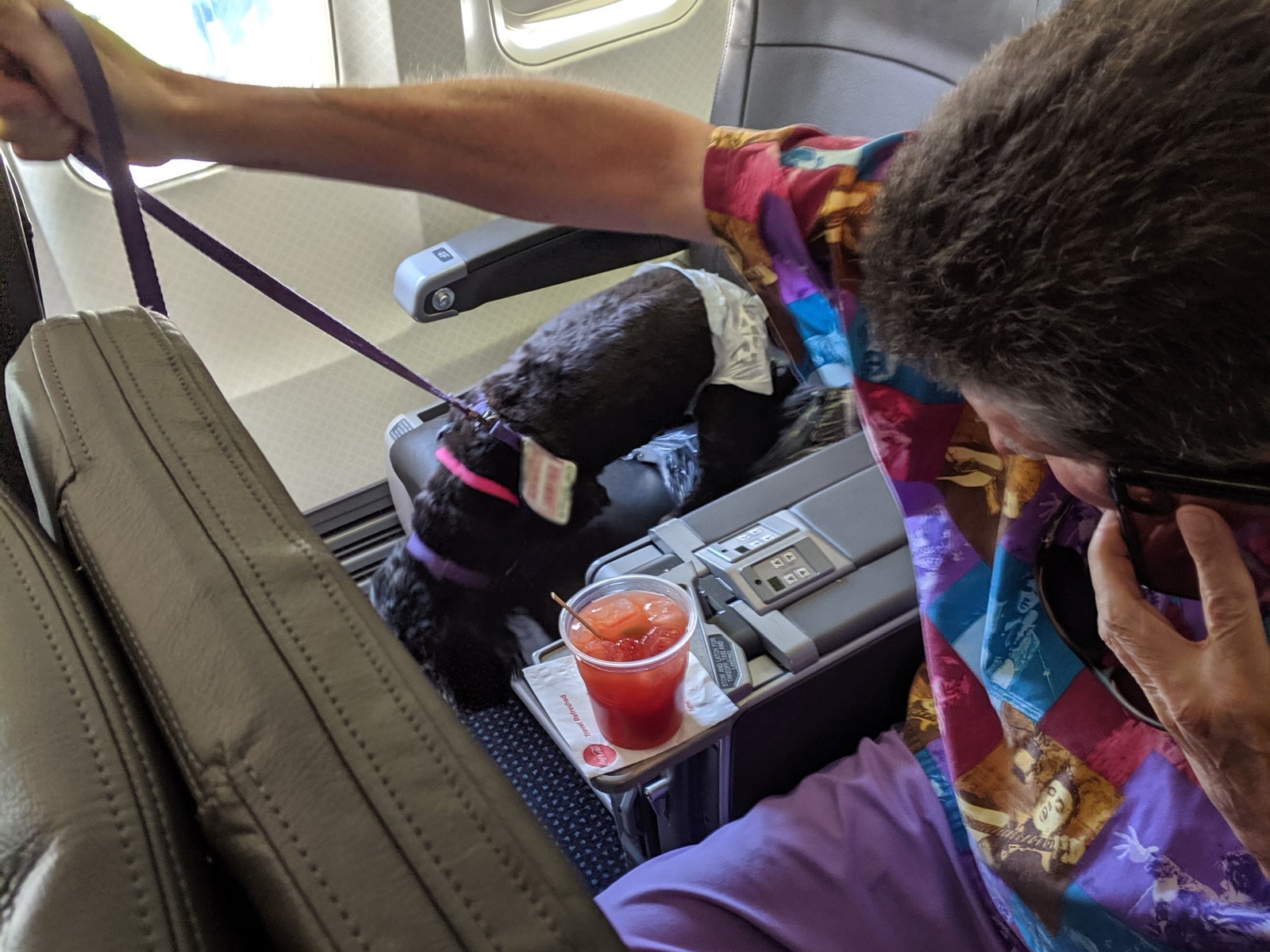 The passenger sitting next to the dog — the dog's owner — was on his cellphone, so it took some time for me to catch his attention and convey that his dog was in my seat. He continued his cellphone conversation but slowly moved the dog to the ground and then into the aisle before turning his knees slightly so I could slide past him to 4F. Once I was in my seat, he relayed to the woman on the other end of his cellphone conversation that "Sully lost her window seat."