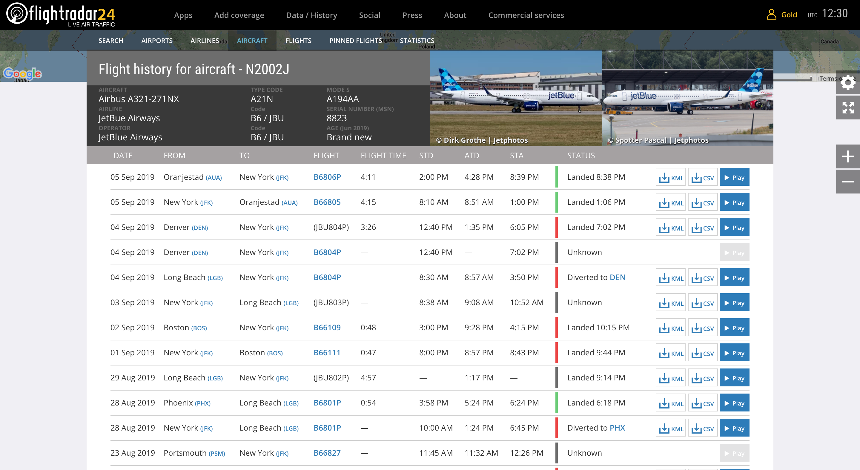 The airplane is based out of New York (JFK), but it's currently being used on a seemingly random set of domestic and Caribbean routes. In the last week, it's been spotted in Boston (BOS), Denver (DEN), Aruba (AUA) and more according to data from flightradar24.com. These are likely test flights, as the flight numbers (in the 6000s) are not normal JetBlue flight numbers.