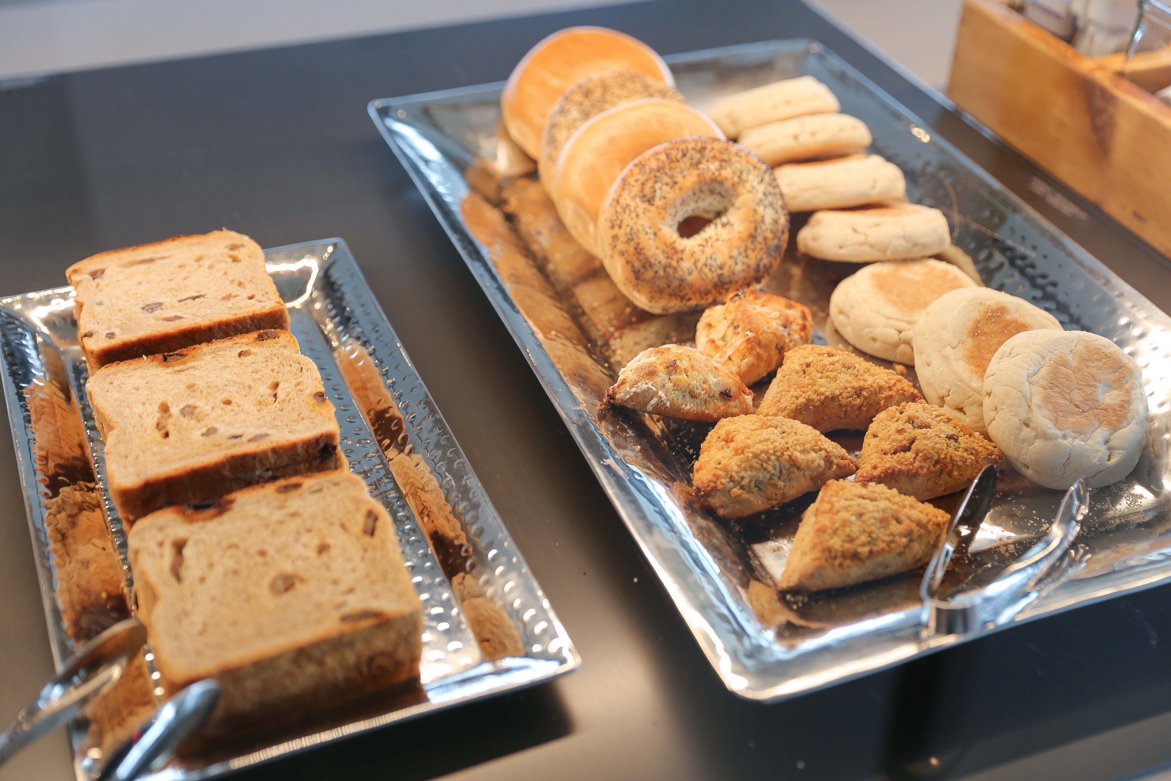 There are two food offerings, morning and afternoon. In the morning you'll have options like bagels, english muffins, greek yogurt and scones. Don't fret, Alaska's famous on-demand pancake machine is in operation here, too.