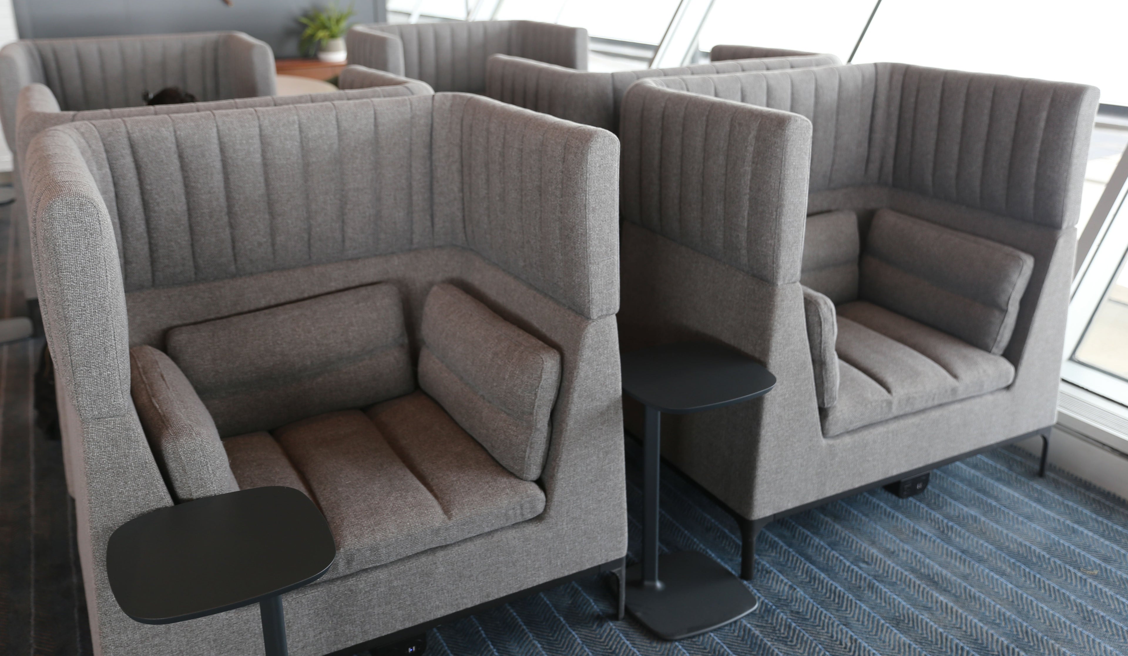 There are 12 chairs that are great for relaxing or taking a phone call, since the high barriers block out the noise from surrounding travelers.