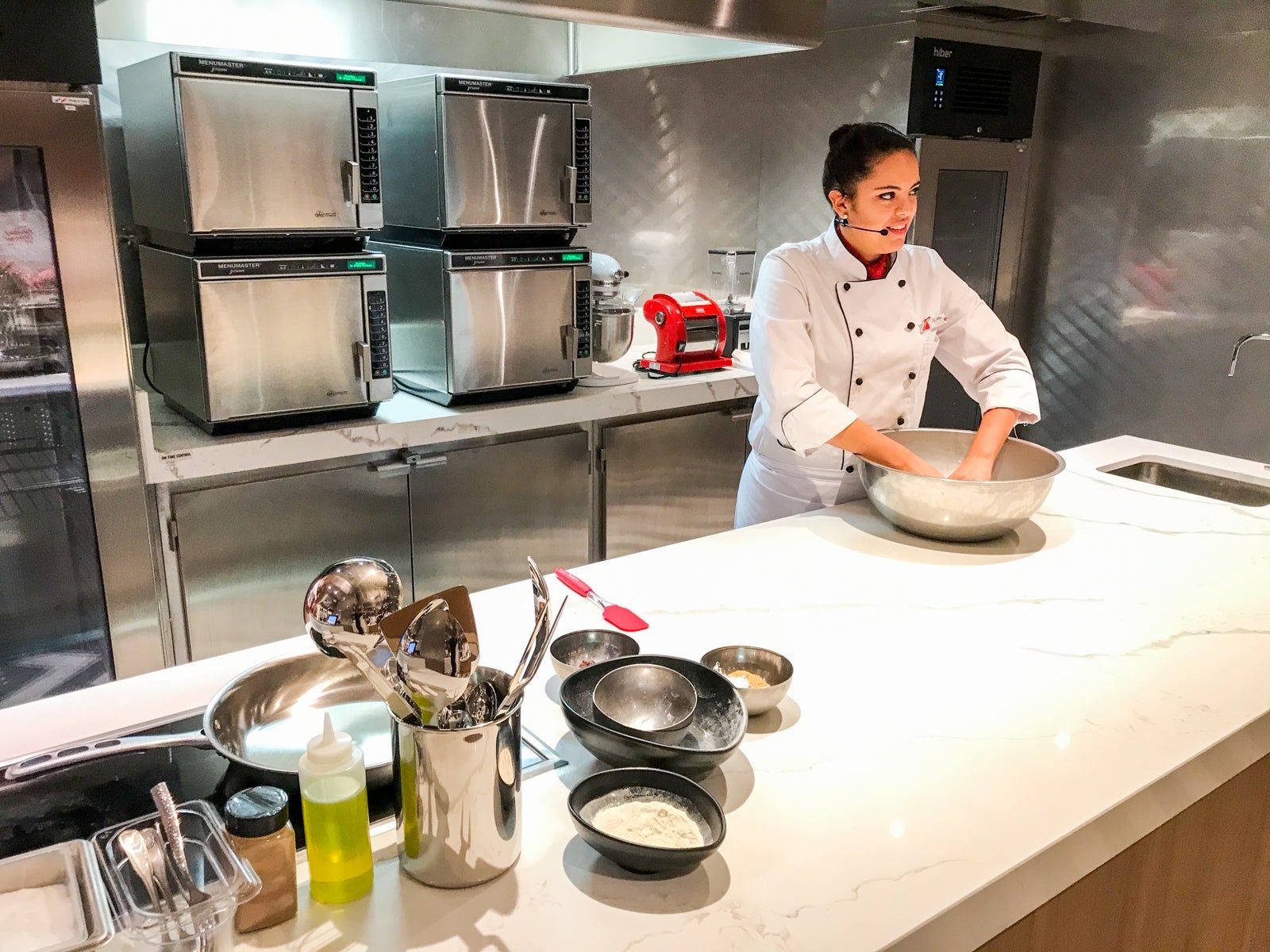 I got to sit in on the very first class to be held in the room, a lesson in apple pie making, and even helped with a little stirring. I found the instruction simple enough, so even the most cooking-challenged traveler can keep up. The flipside is that serious amateur chefs may find it a bit basic (usually the case with cruise ship cooking classrooms).