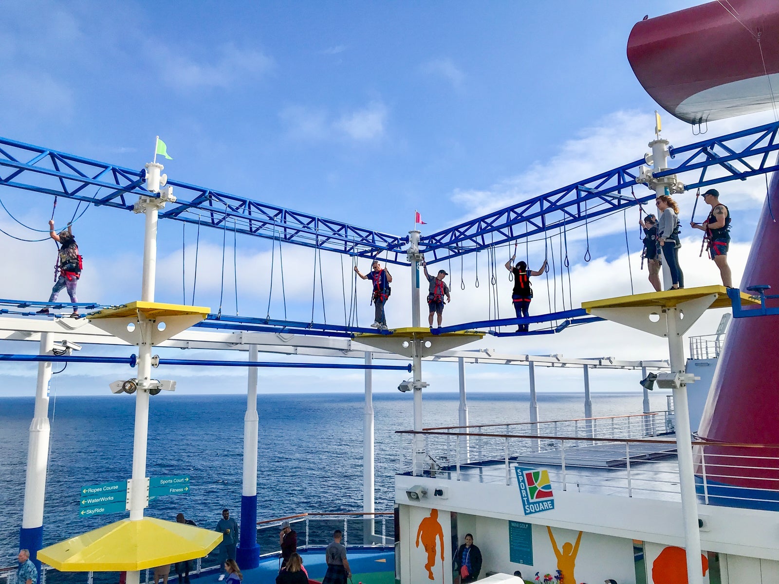 Like the WaterWorks area, the SportSquare on Carnival Panorama will be familiar to Carnival aficionados. It's home to a suspended-in-the-air, pedal-powered SkyRide (something that first debuted in 2016 on Carnival Vista and is now on three ships), a suspended-in-the-air ropes course, a basketball court, miniature golf, miniature bowling, ping pong tables and other outdoor games.