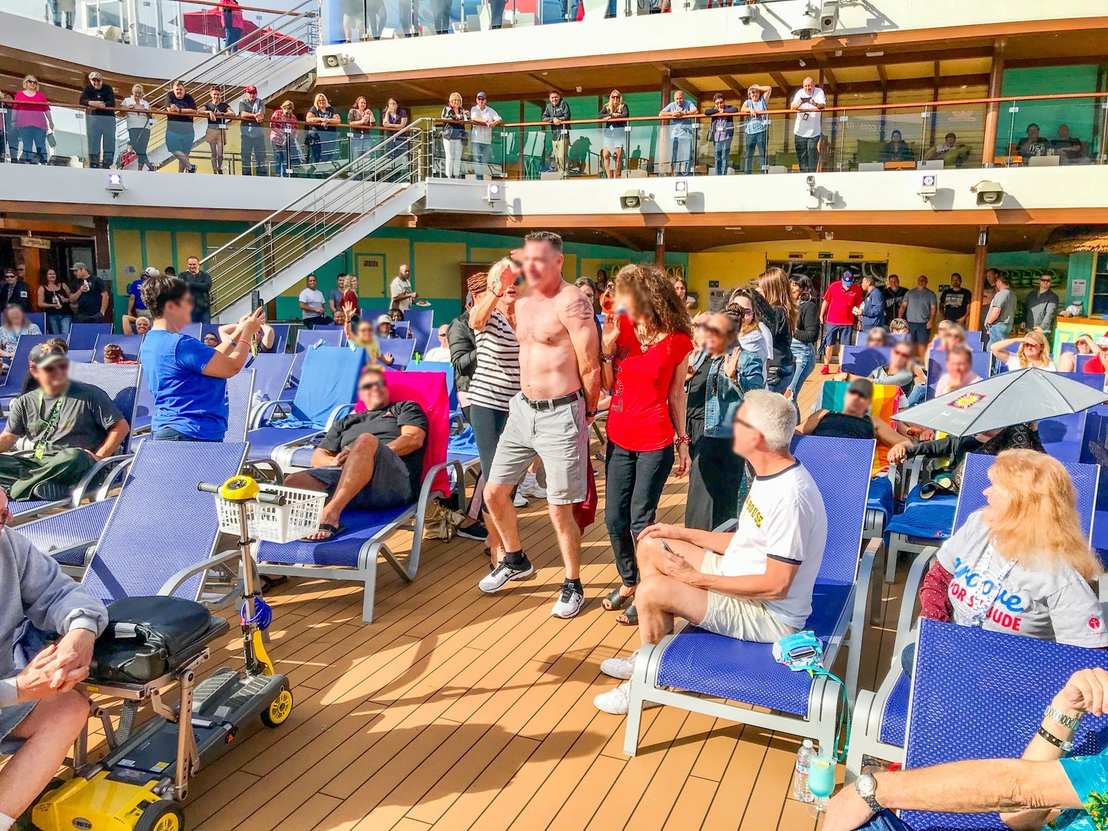Up by the pool, the interactive hijinks got even wilder with prime sunning hours interrupted by such larks as a raucous poolside dance-a-thon and a hairy chest contest. Yes, Carnival is that line. Both drew standing-room-only, hooting-and-hollering crowds.