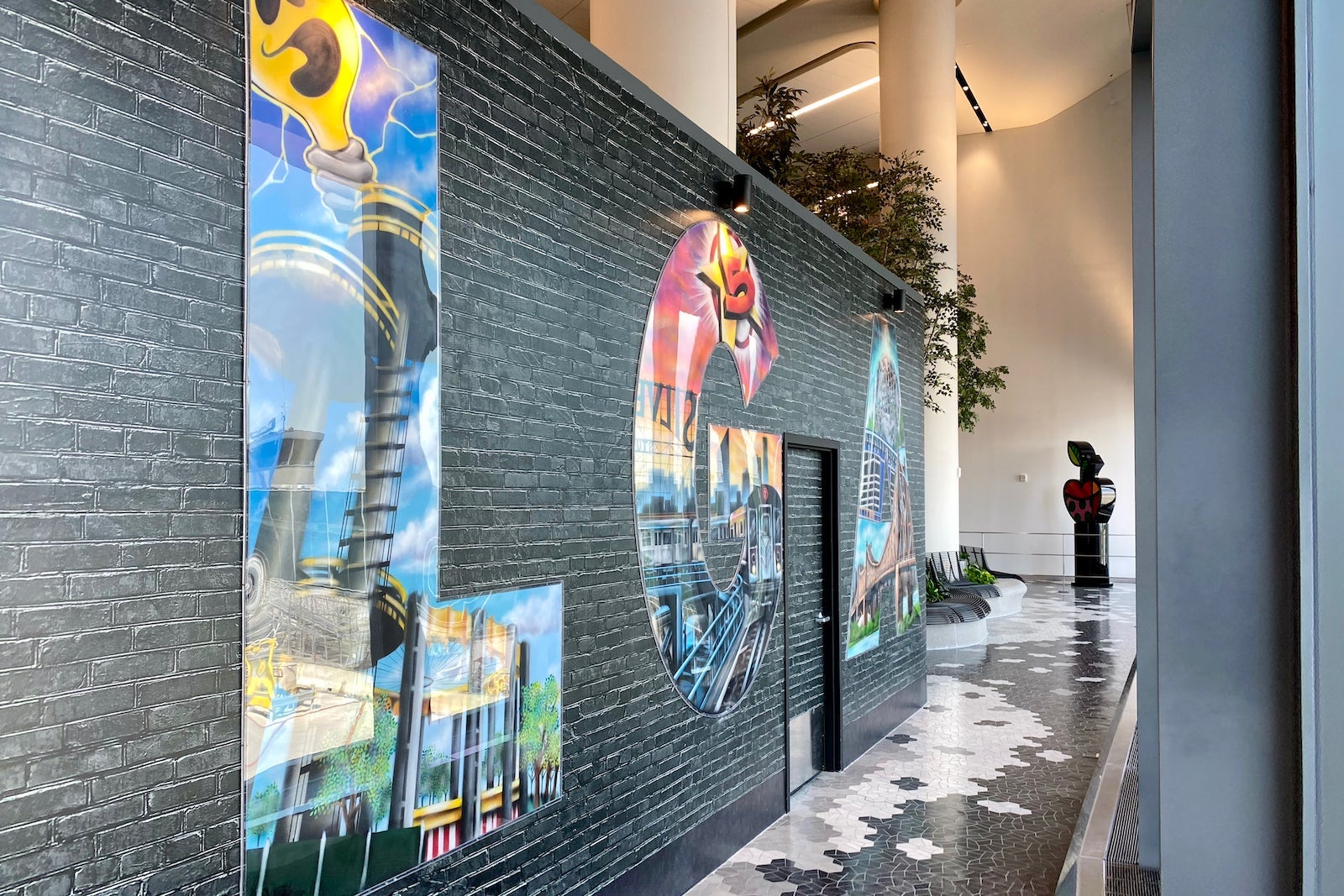 Behind the Gotham News store is the concourse's second art installation. Titled A Queens Tribute, the artist designed a "visual postcard" from Queens, with colorful designs on an "L", "G" and "A". The piece faces the tarmac so that it's seen from planes as they pull into the gate.