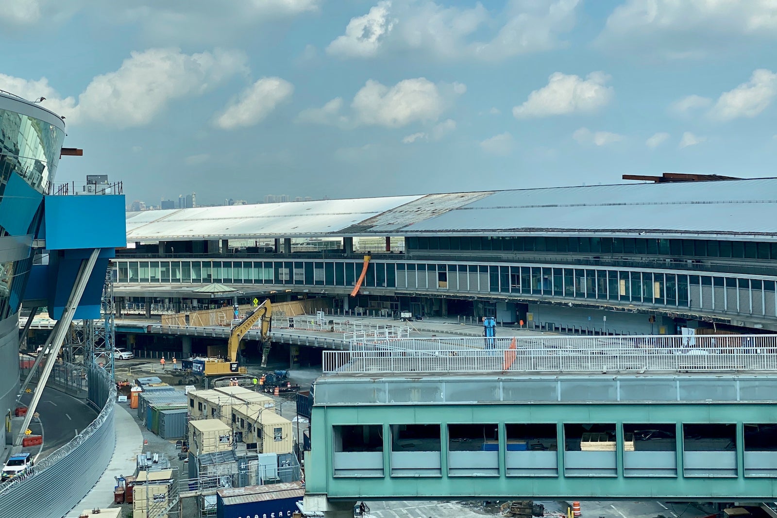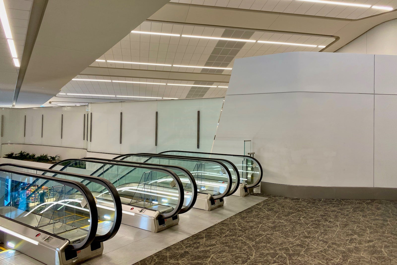 Back at the bottom of the escalators are the gates to your right. If you turn left, you'll see a nearly 56-foot-high construction wall that will be knocked down when the remaining 10 gates are ready to open.