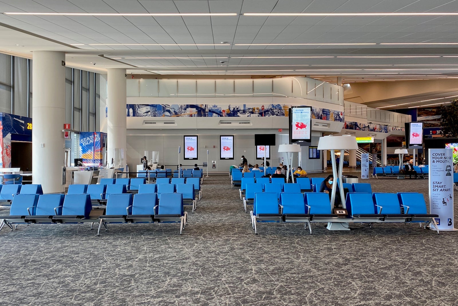 There's plenty of blue-colored seating spread out throughout the gate areas.