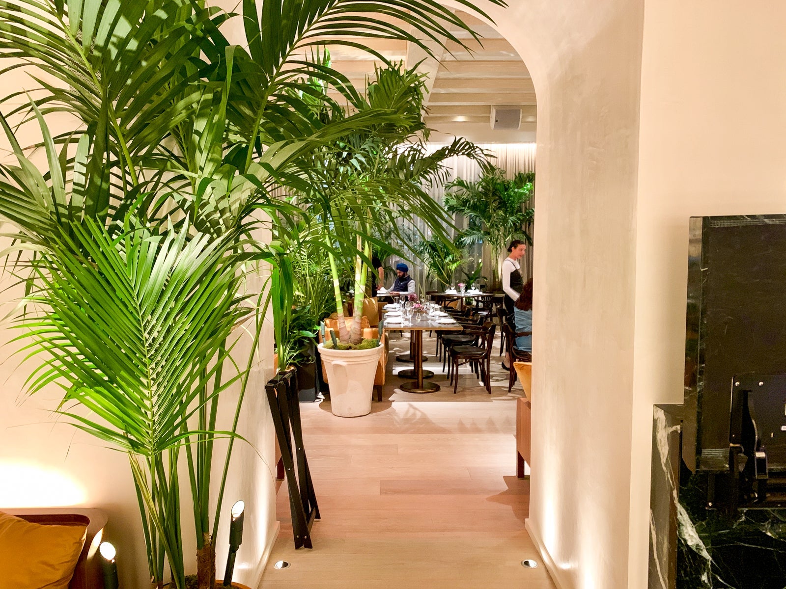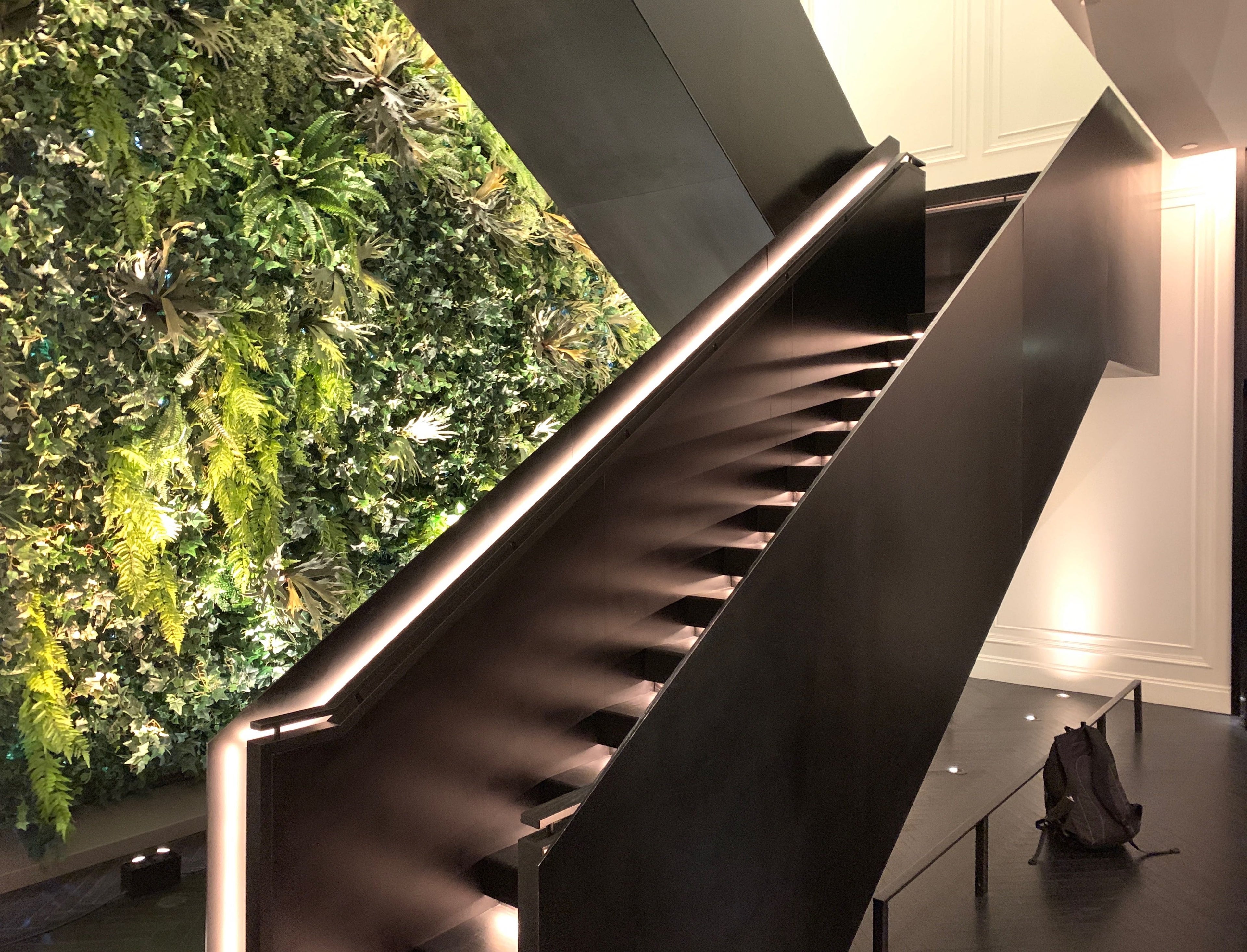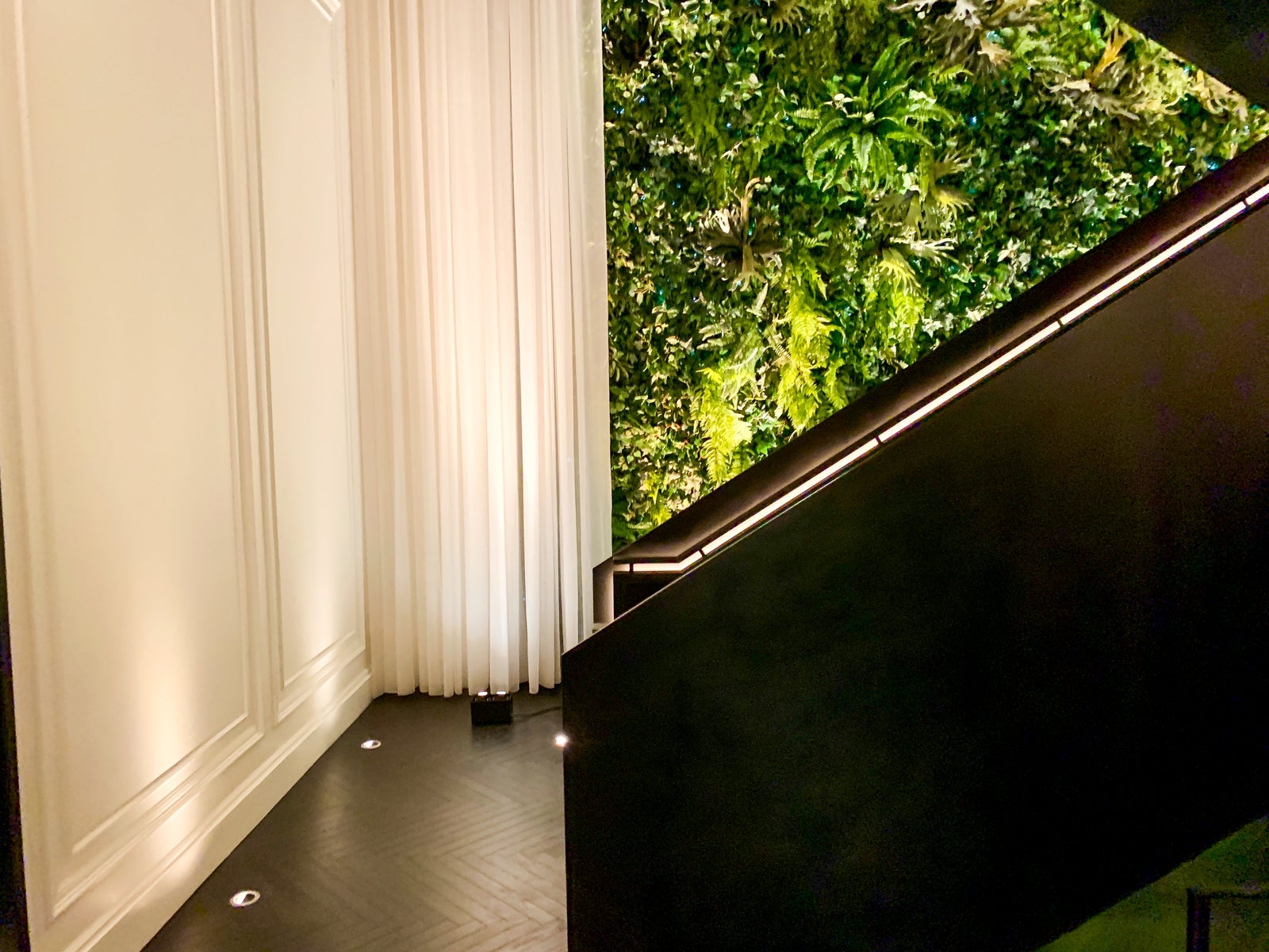 The hotel's lobby is a relatively small space, framed by plant-covered walls both behind the check-in desk and a black scissor staircase, a departure from the typical circular staircases that are in other Edition properties.
