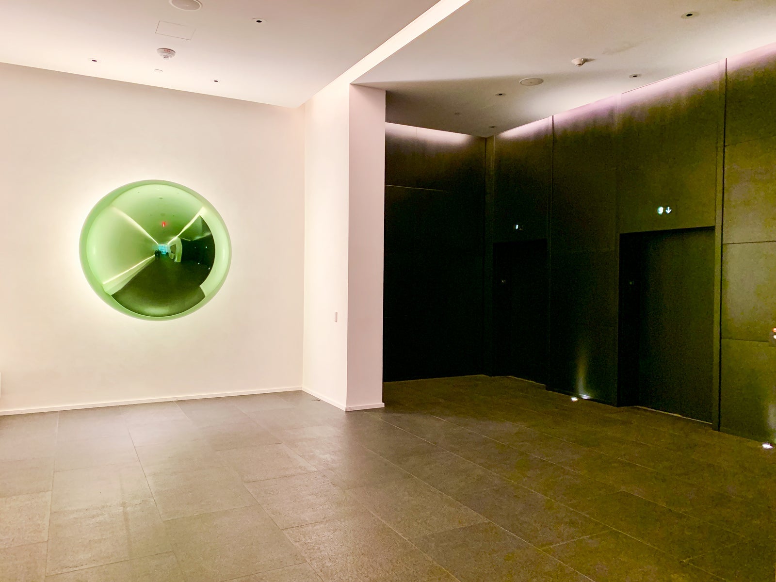 The property occupies a new building that houses just the hotel -- once you enter off of W. 47th Street, there's a noticeable and immediate calming effect, with the hotel's double doors opening onto a long, white hallway with a large, green orb at the end. To the right is a bank of elevators to carry you to the lobby and public spaces.