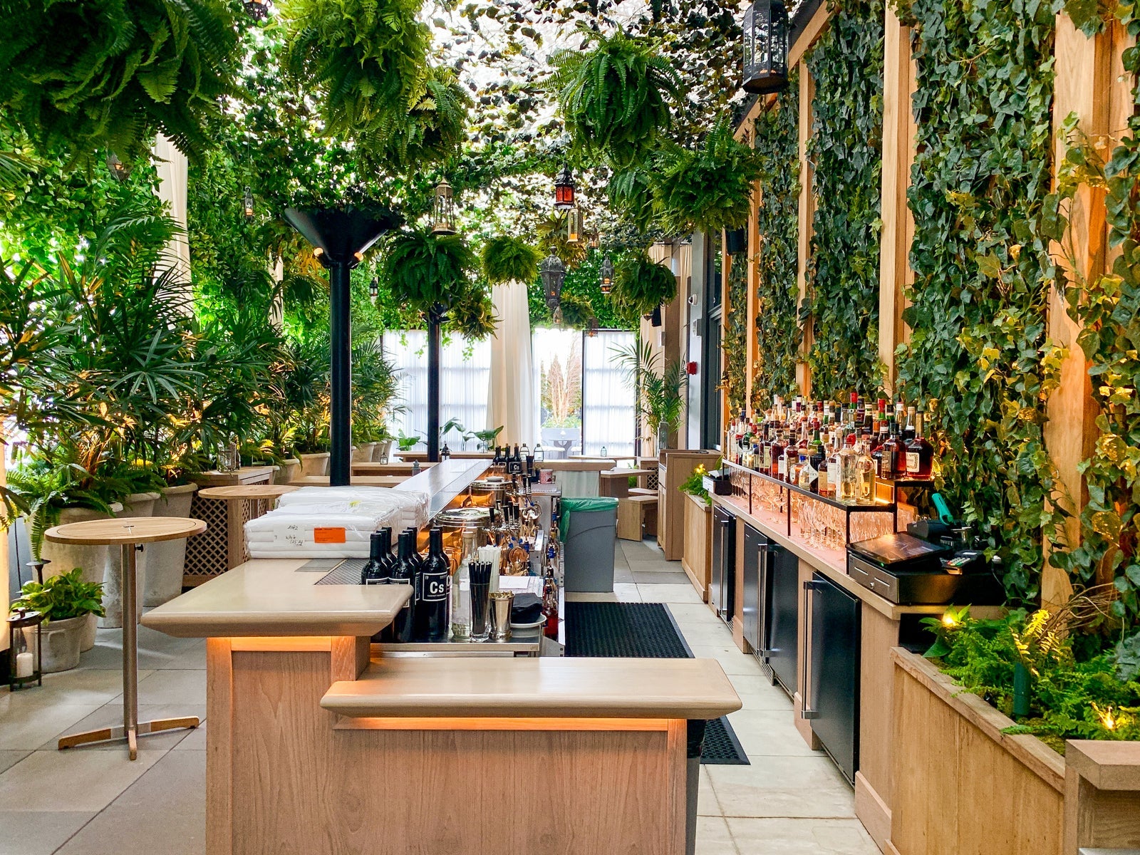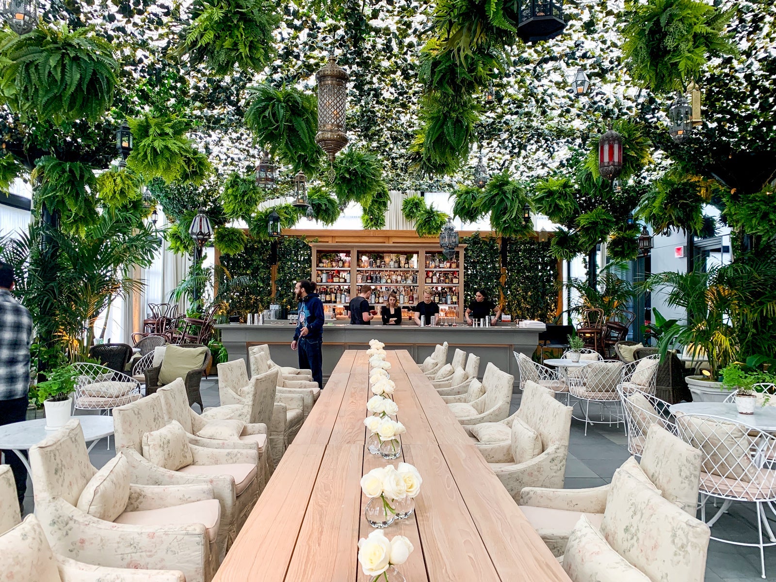 Down on the the ninth floor, travelers will find more public spaces. It's divided into the hotel's all-day restaurant, The Terrace; a gorgeous bar with a vaulted ceiling, an antique mirror and red-velvet barstools; an indoor garden space adorned with a staggering amount of greenery; and an outdoor, covered terrace with picnic tables and a dizzying number of beers on tap.