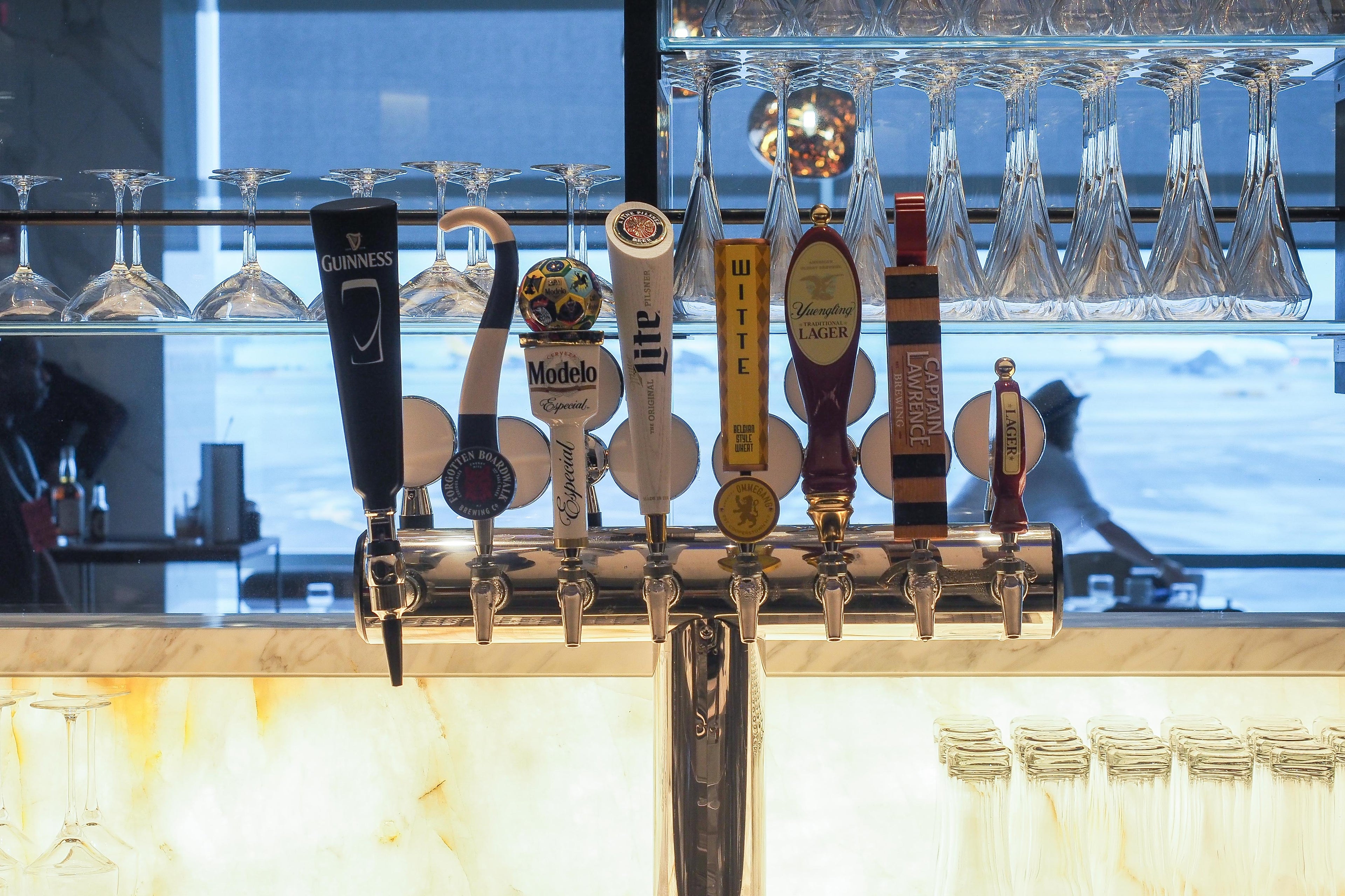 Decked out in white marble and blue lights, the bar is one of the first things you see upon entering the lounge. You'll be able to choose from a wide variety of beer, wine and custom spirits.