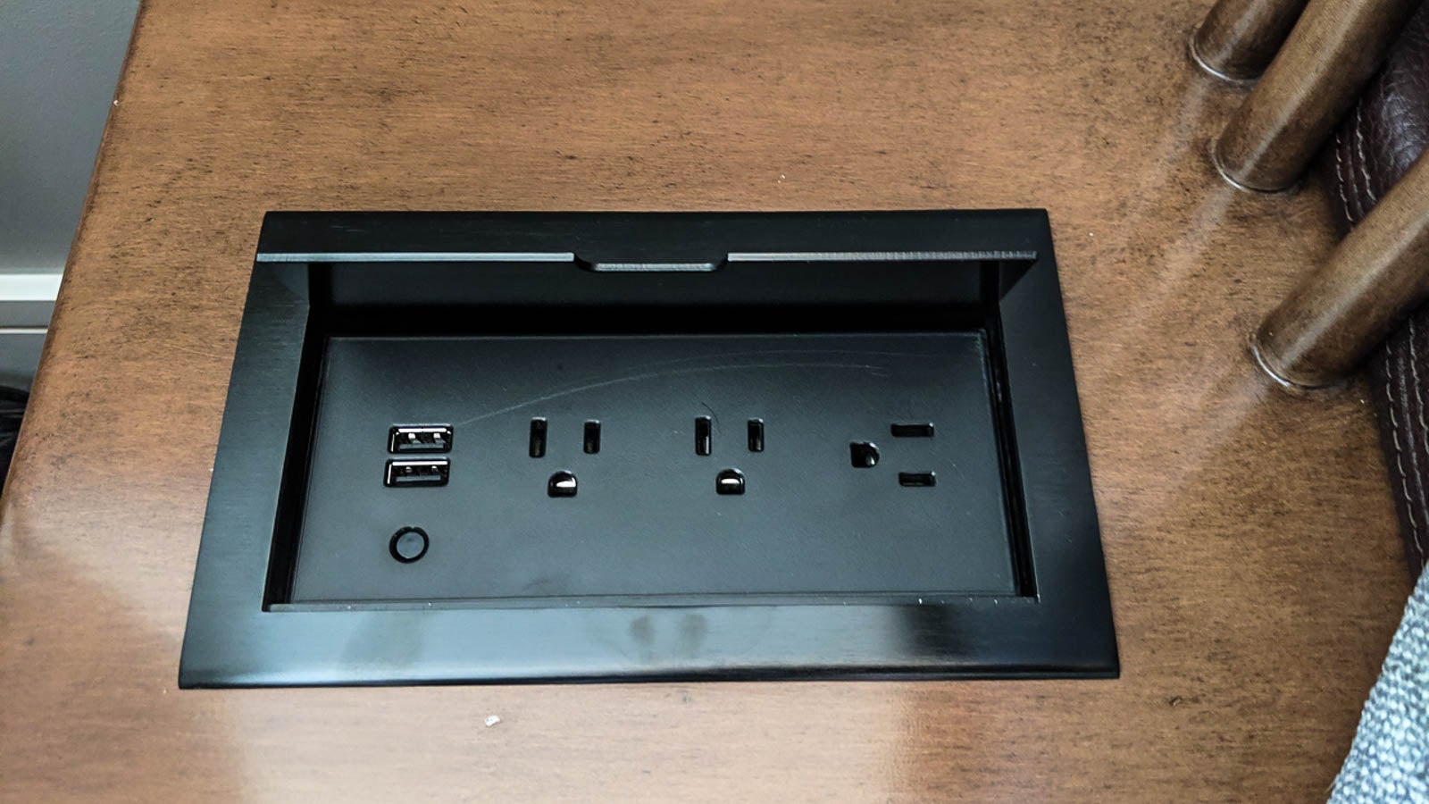 Even the leather built-in seats came with outlets for optimal work efficiency.