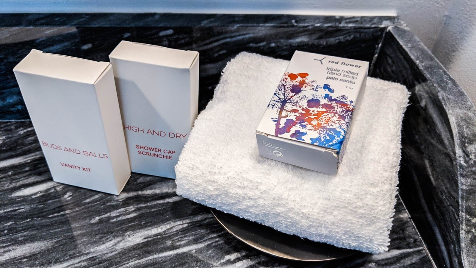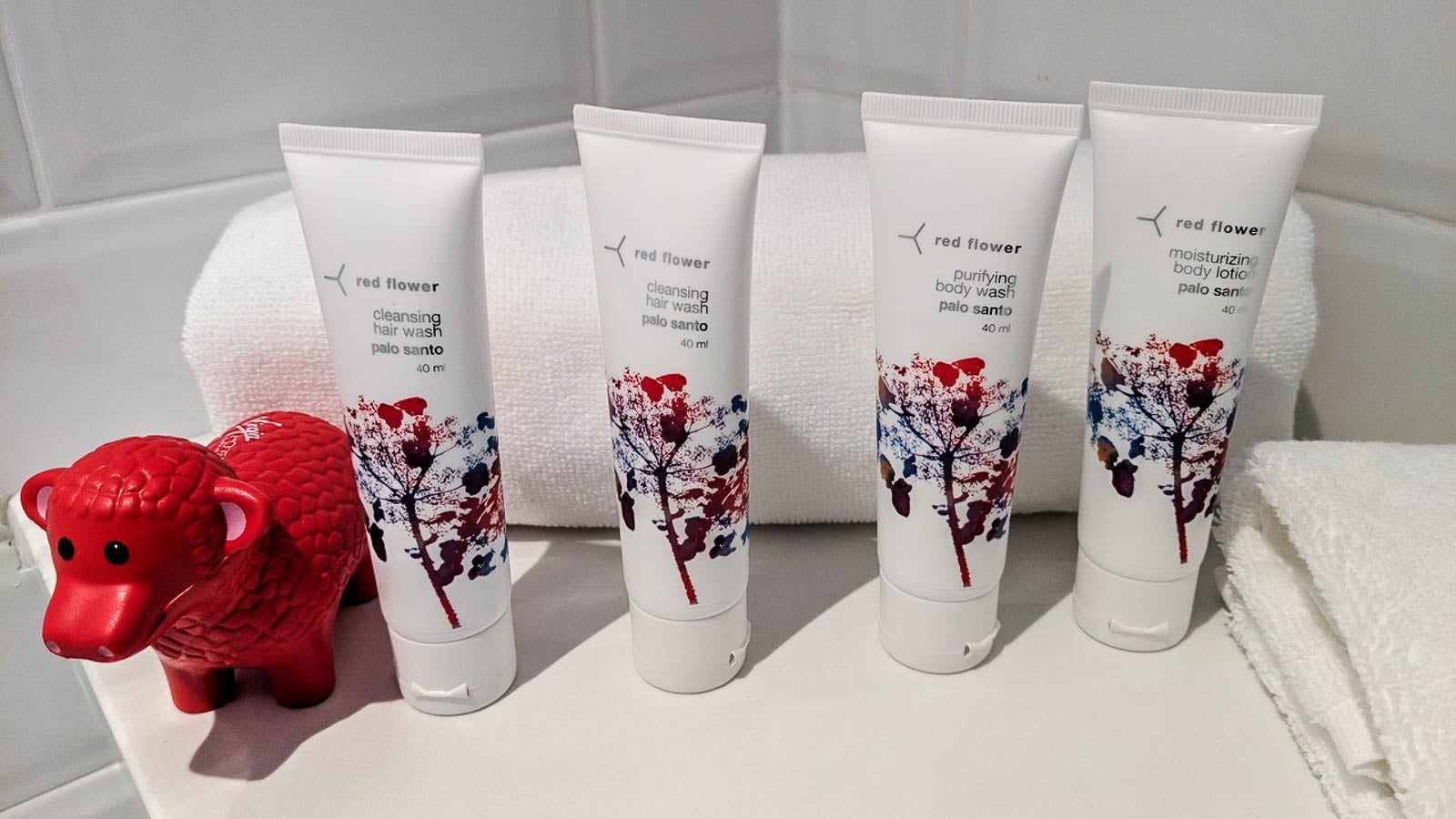 The hotel's signature little red mascot, Snoozy the Sheep, peeked out from behind the towels and shower products.