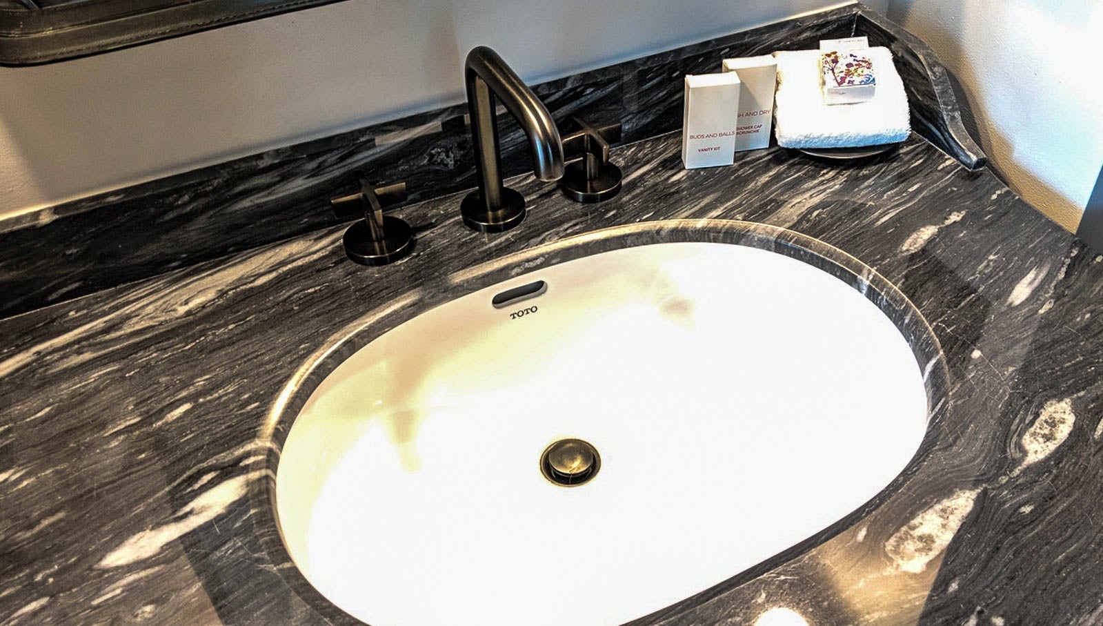 The in-room sink lived on the other side of the vanity nook, resulting in a very cozily appointed space that might feel cramped for two busy people trying to get ready at the same time.