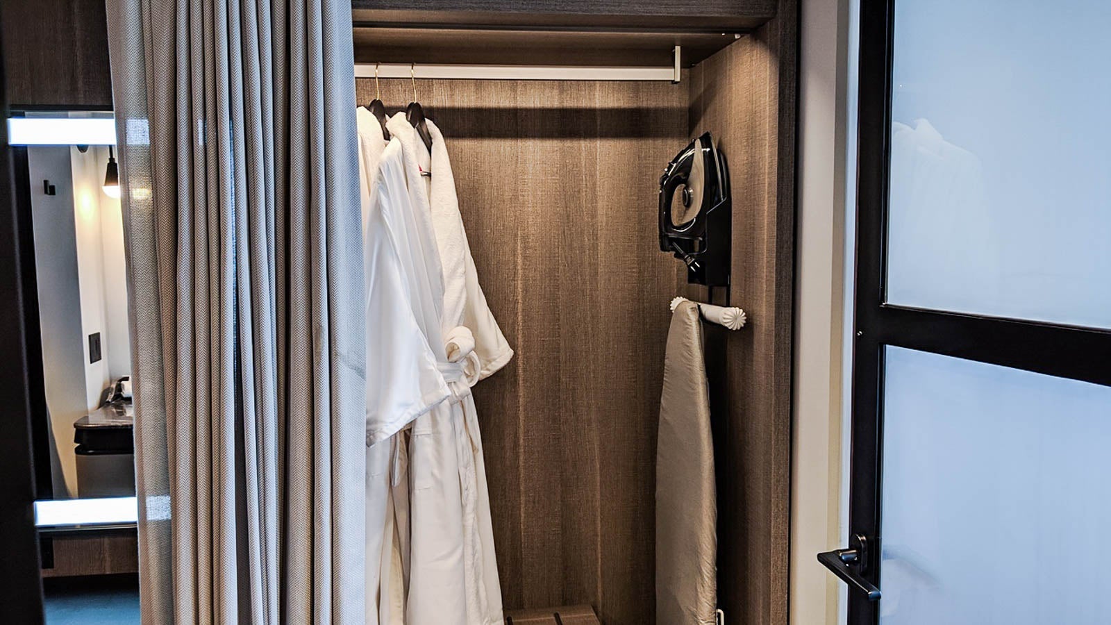 A vanity nook was tucked between the two closet sections, one of which held a complimentary yoga mat as well as the standard ironing board and iron, hangers, dry-clean bags and extra bedding.