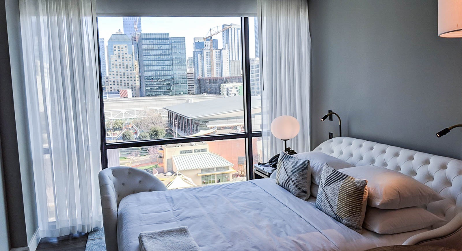 Each bedroom faces the city with a full wall of floor-to-ceiling windows, dressed in double layers of sheer and blackout curtains.