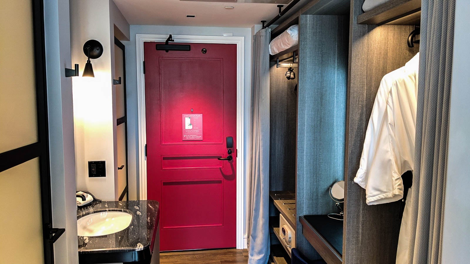 The Virgin Hotels brand calls its rooms "Chambers" for the unique two-room style. From the front entrance, a narrow hallway was flanked by dual curtain-covered closet areas on one side, and two translucent glass doors hiding the toilet and the shower, respectively.