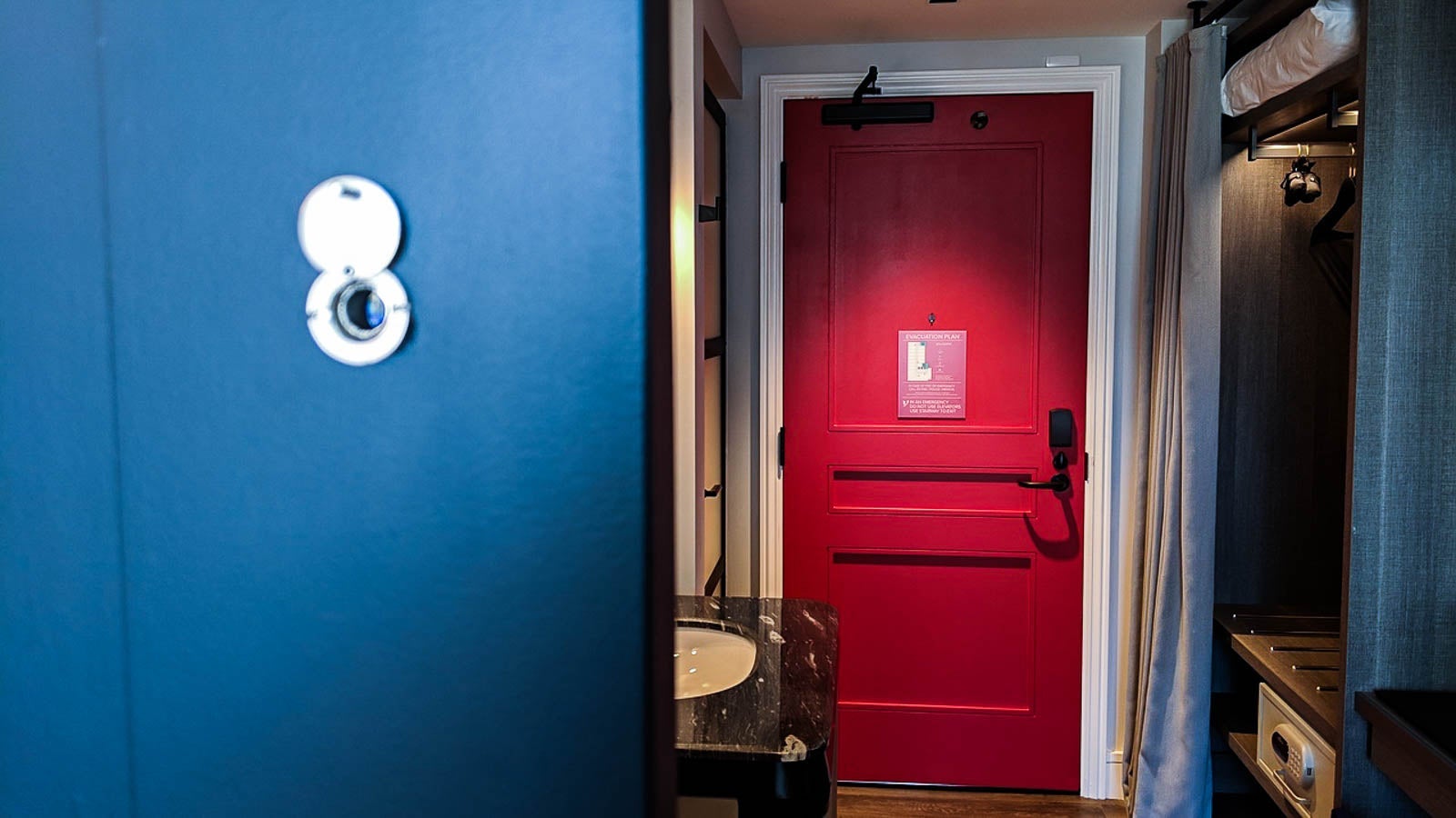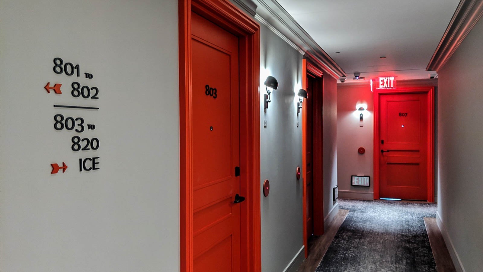 The hotel room hallways are the most overtly "Virgin" part of the entire hotel, with bold red doors against crisp white walls.