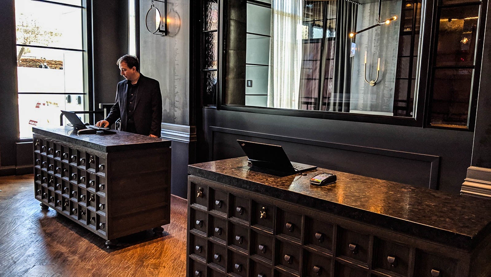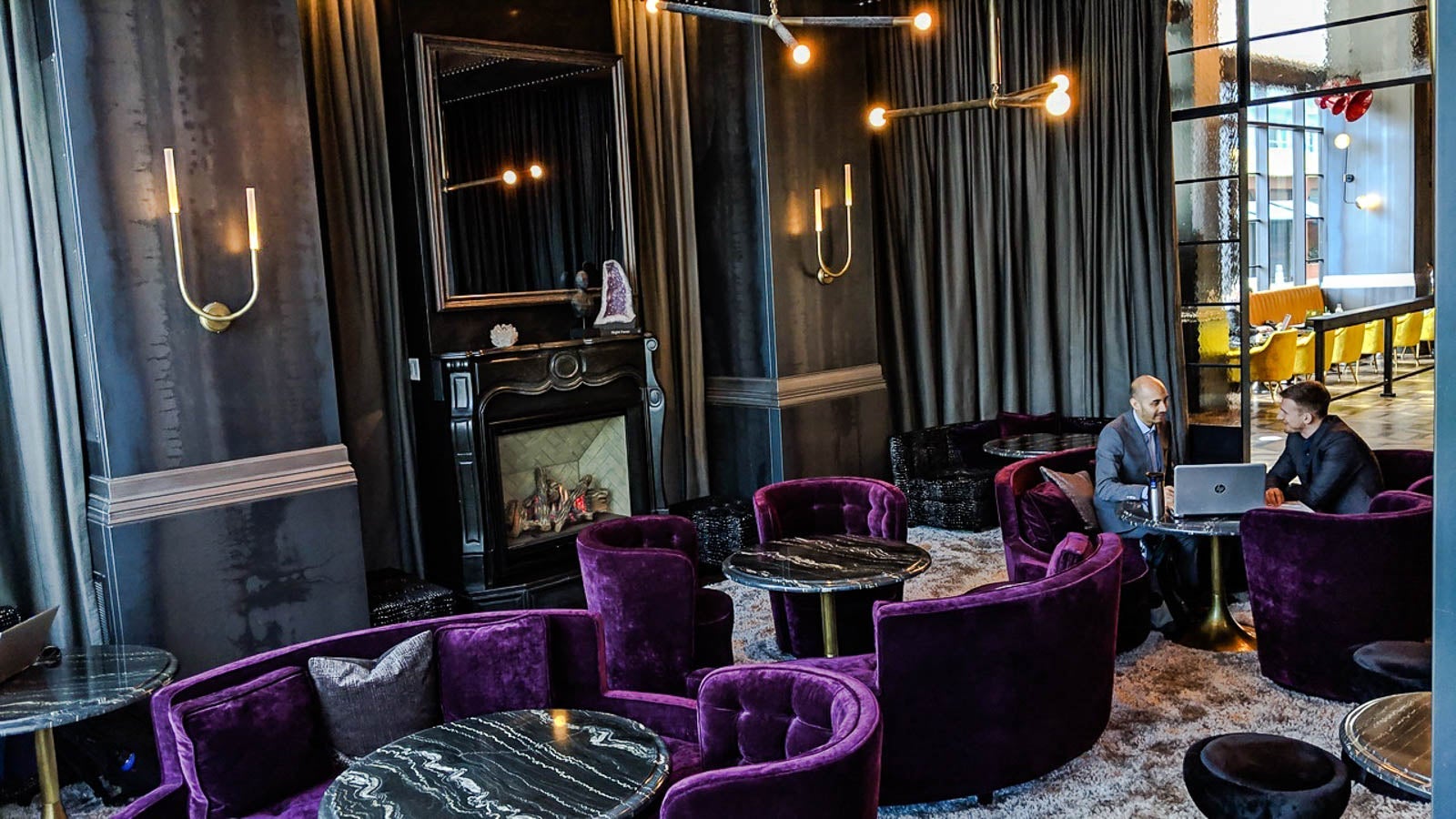 Alternatively, you can duck left into the Shag Room — thus named for the carpet, I was informed by a hotel employee — which features a real fireplace, rich velvet seating and a place to kick back and relax while the front desk staff come to you.