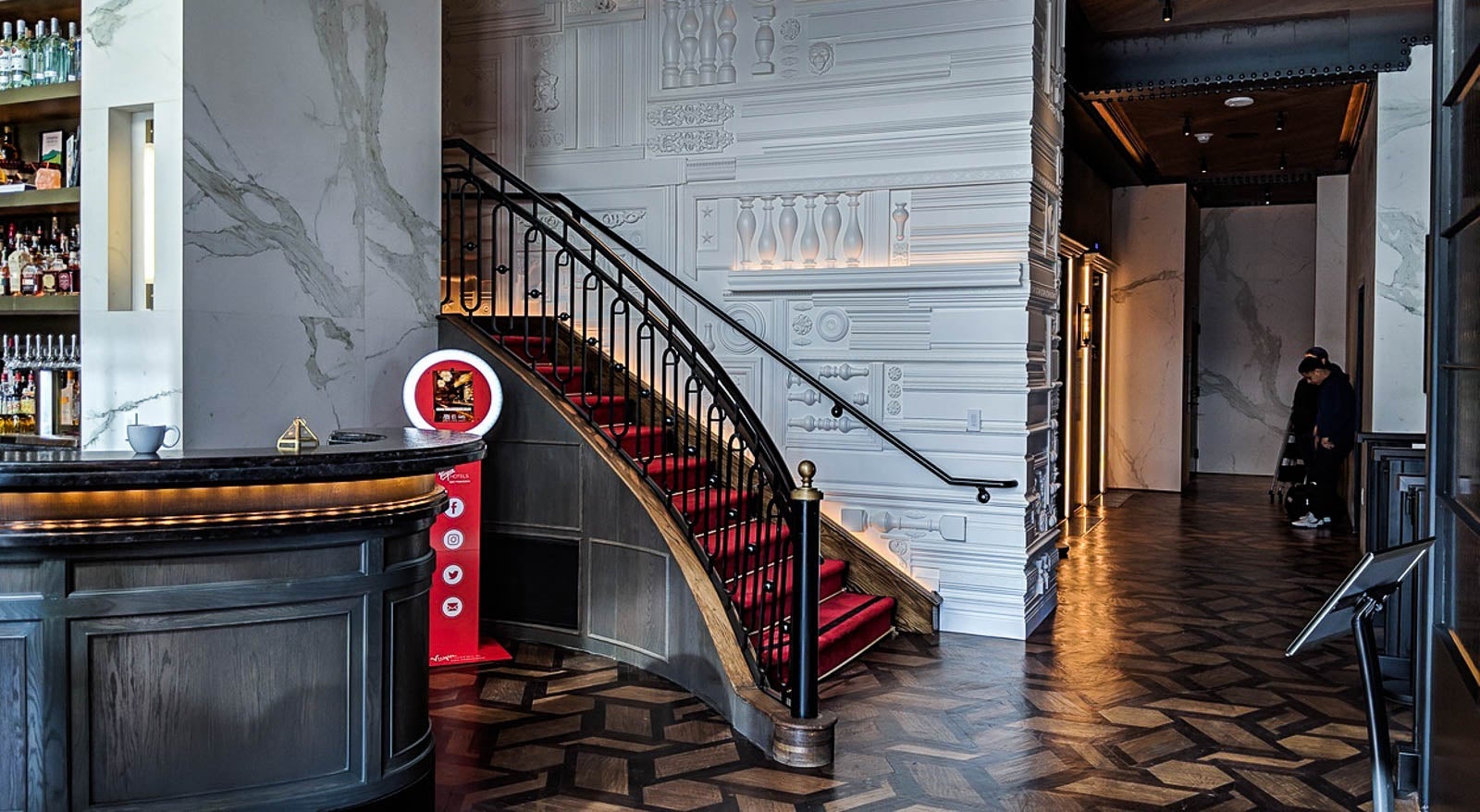 Bold red speakers give nod to the hotel's roots from the iconic Virgin Records brand.