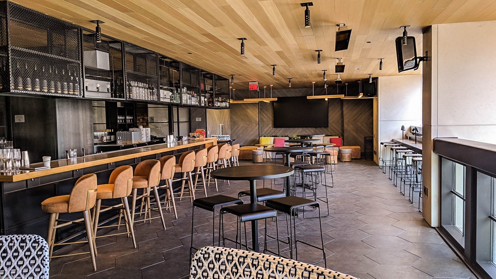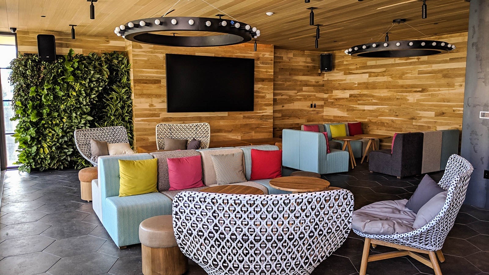The hotel's second floor was also home to the Upstairs at the Common Club area — an open-air patio space with lounge seating and more work-friendly spots, replete with lighting and outlets.