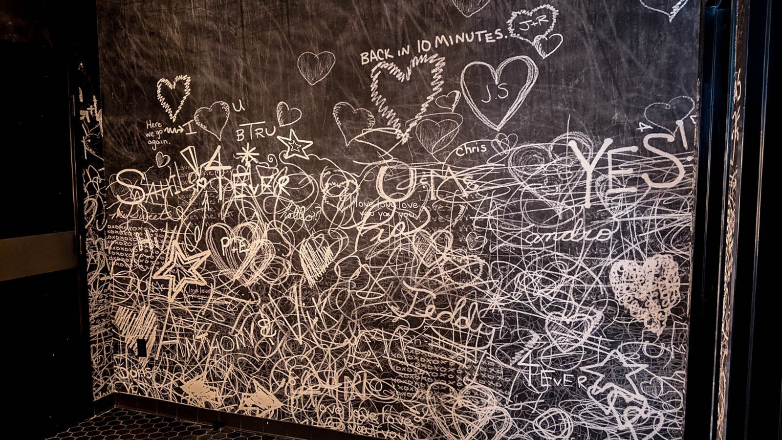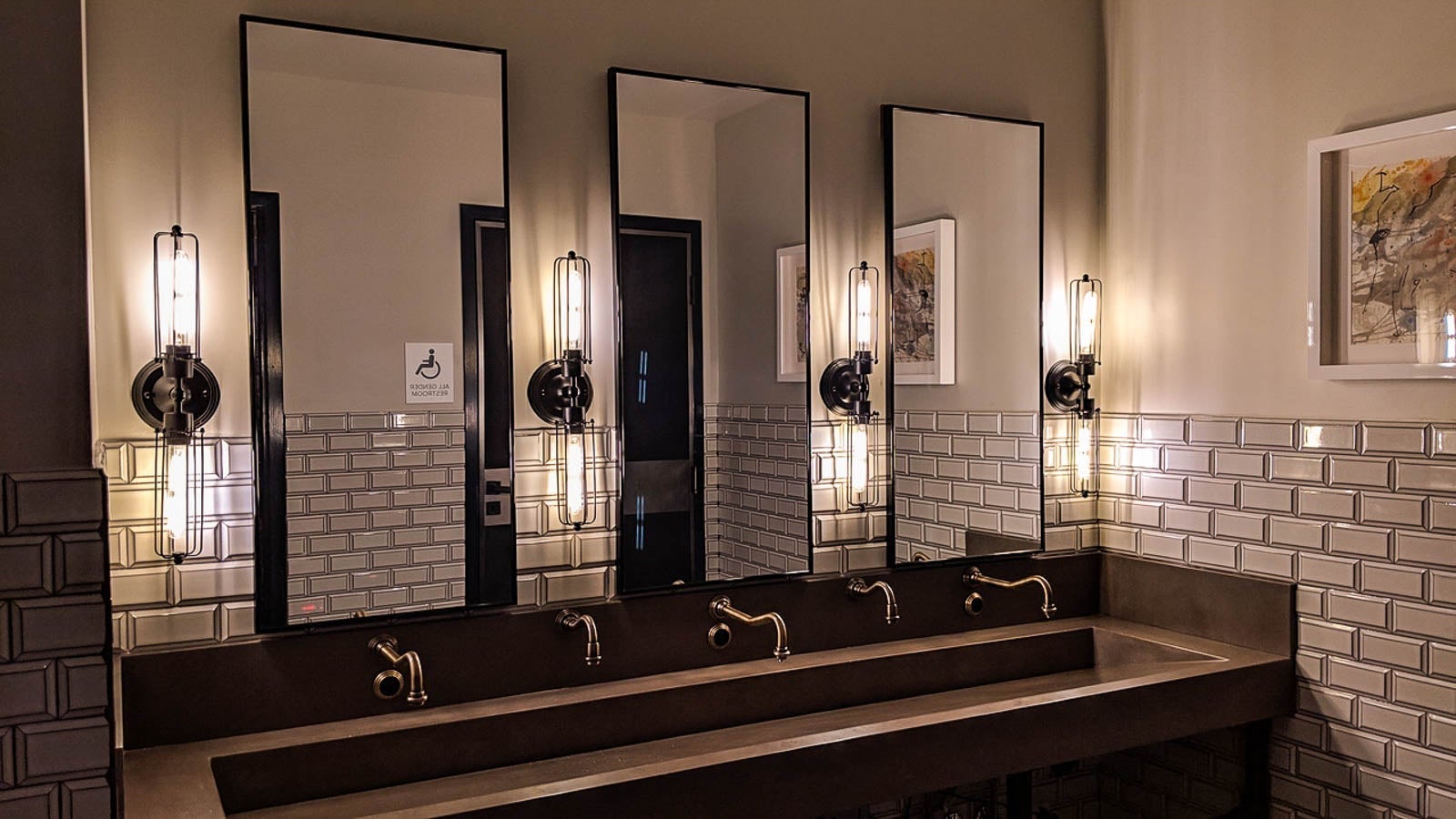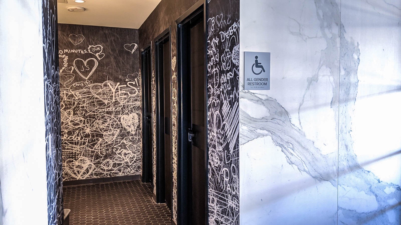 Whimsical, contemporary-styled bathroom areas were clearly marked for all genders, with individual stalls leading out to a common sink and styling area.