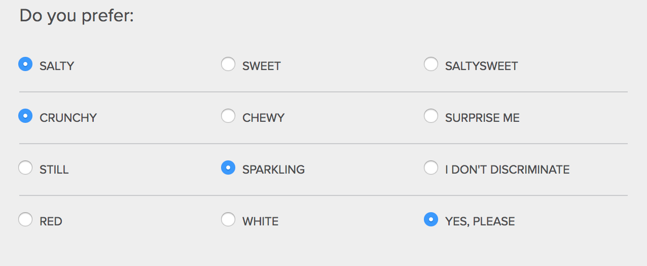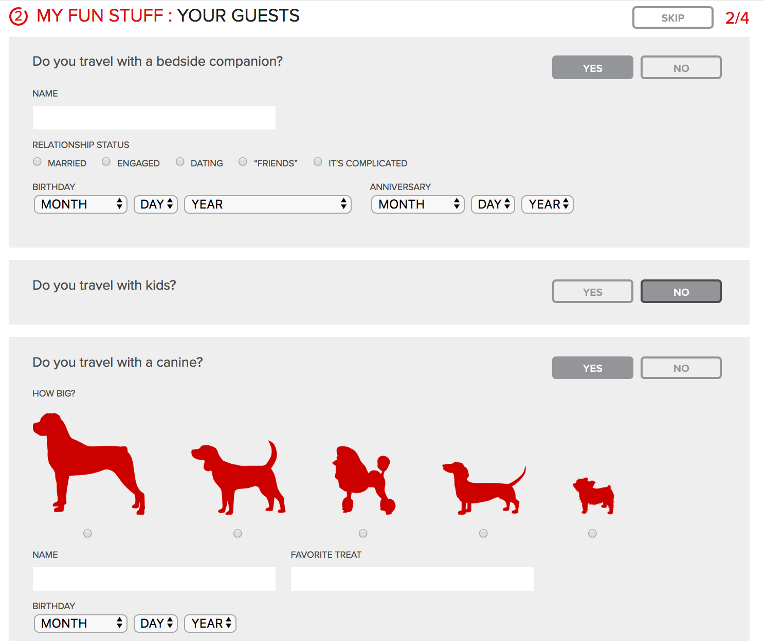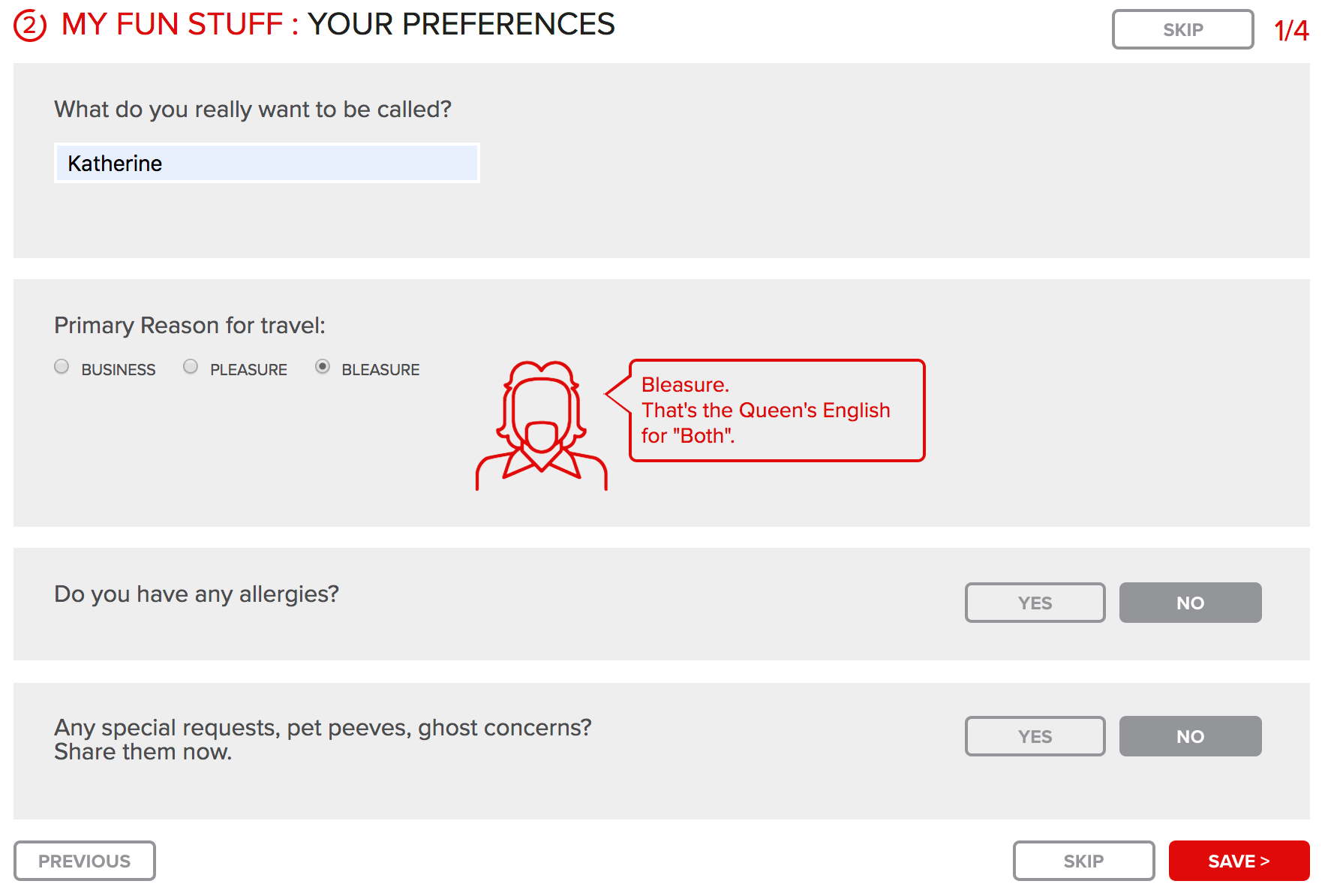 The quiz verbiage includes fun little Easter eggs such as the "It's not polite to ask" option under your birth year, or "bleasure" as a third option besides business or pleasure travel.