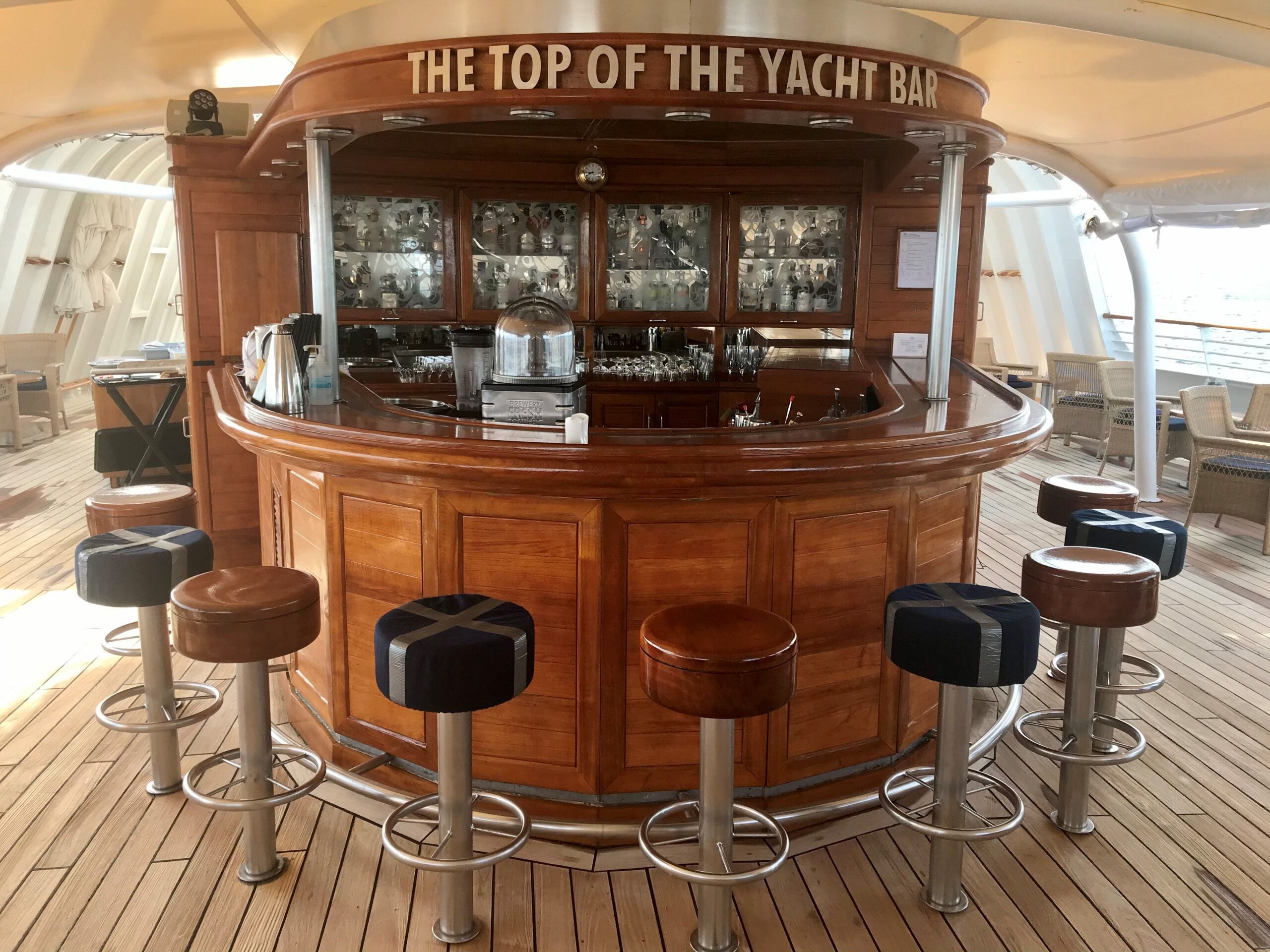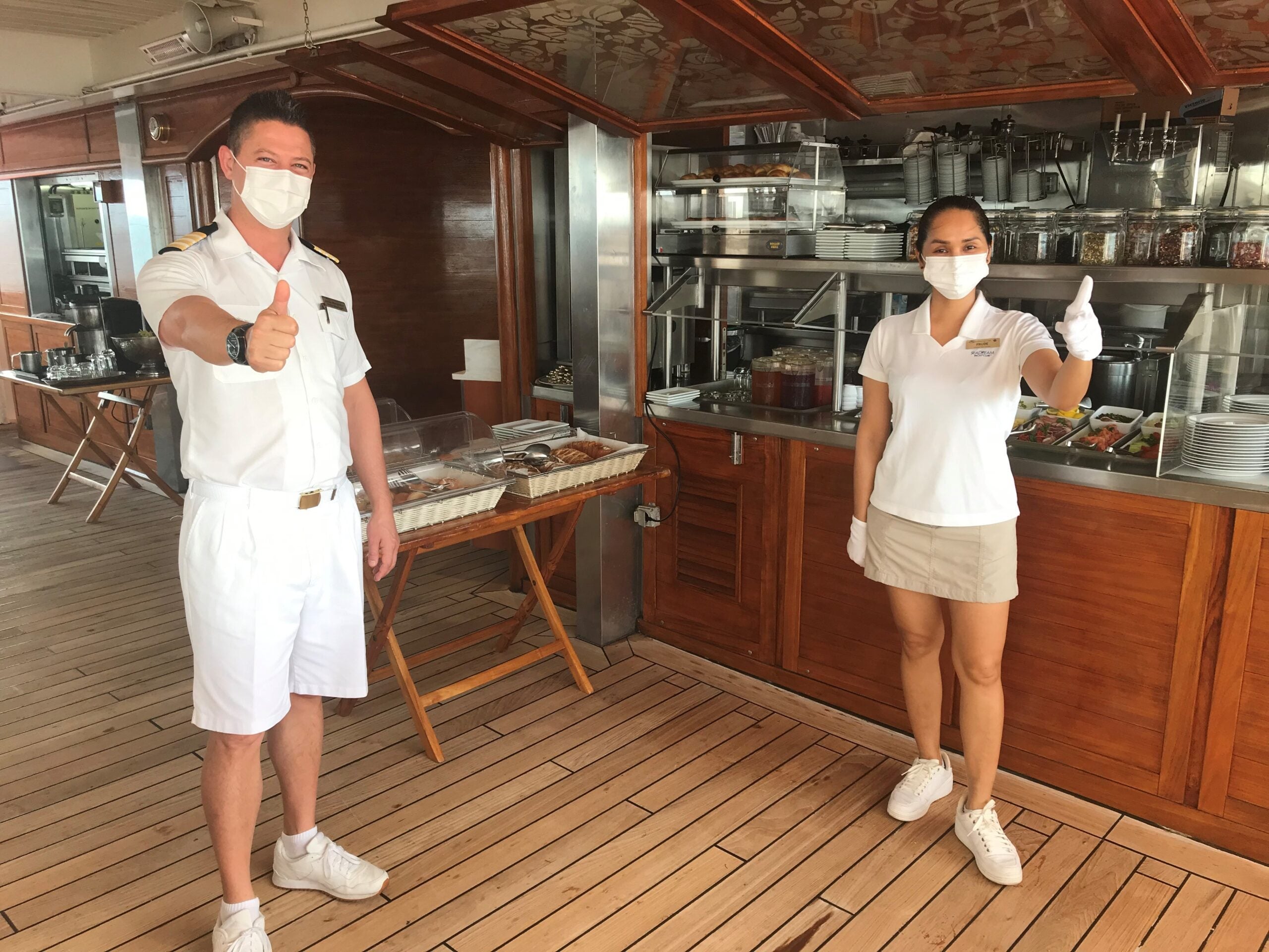 Early risers are up at the Top of the Yacht Bar soon after the sun comes up, chatting at a distance over coffee and croissants as the ship maneuvers into an anchorage for the day. The nearby outdoor Topside Restaurant soon is buzzing with wait staff serving up made-to-order omelettes and eggs Benedict.