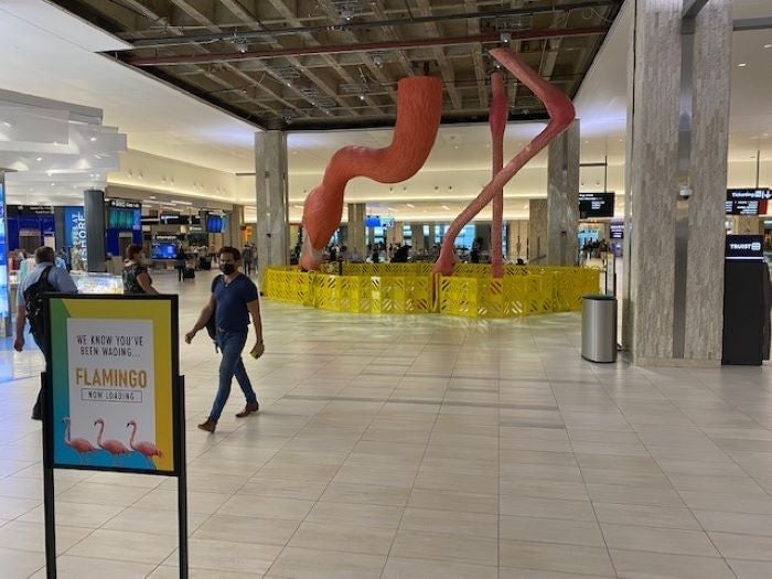 A 21-foot flamingo sculpture by Matthew Mazzotta depicting a flamingo gently dipping its head beneath the surface of the water is being installed in the center of TPA's main terminal.