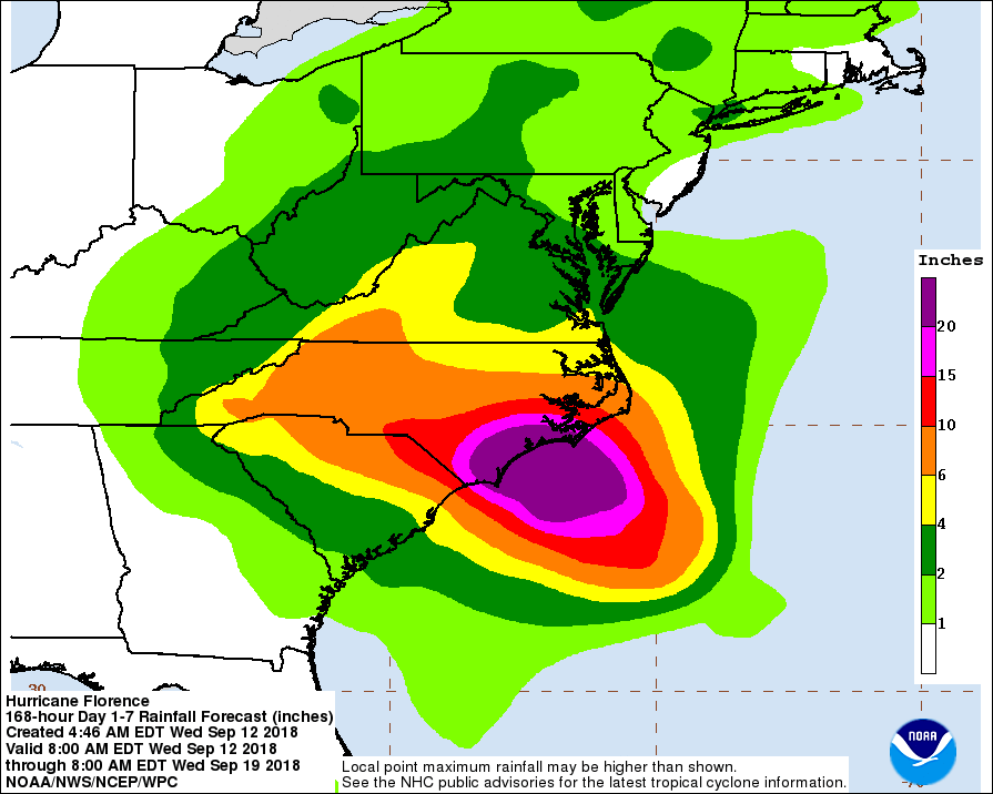 While some models are predicting up to 45 inches of rain in NC, the official National Hurricane Center rainfall forecast calls for: