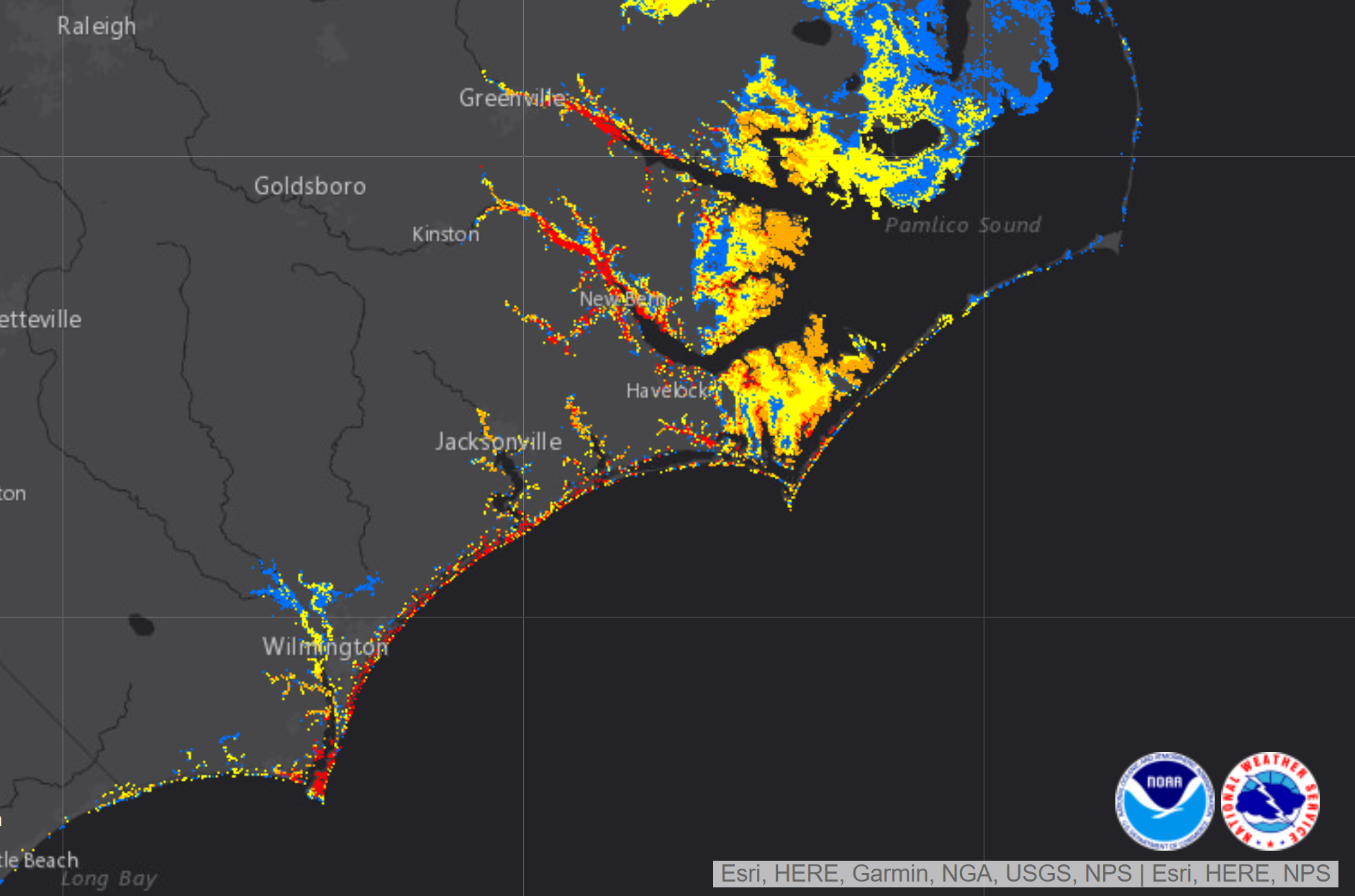 While rainfall is going to cause widespread flooding, the biggest threat to coastal North Carolina and South Carolina remains disastrous storm surge. The powerful hurricane is expected to push a wall of water toward the coast as it approaches, with the worst conditions being on the northside of the storm due to the counterclockwise motion. The latest storm surge models forecast catastrophic flooding for the North Carolina coast, with large parts of the coast — colored in red below — expecting to be flooded with more than nine feet of storm surge.