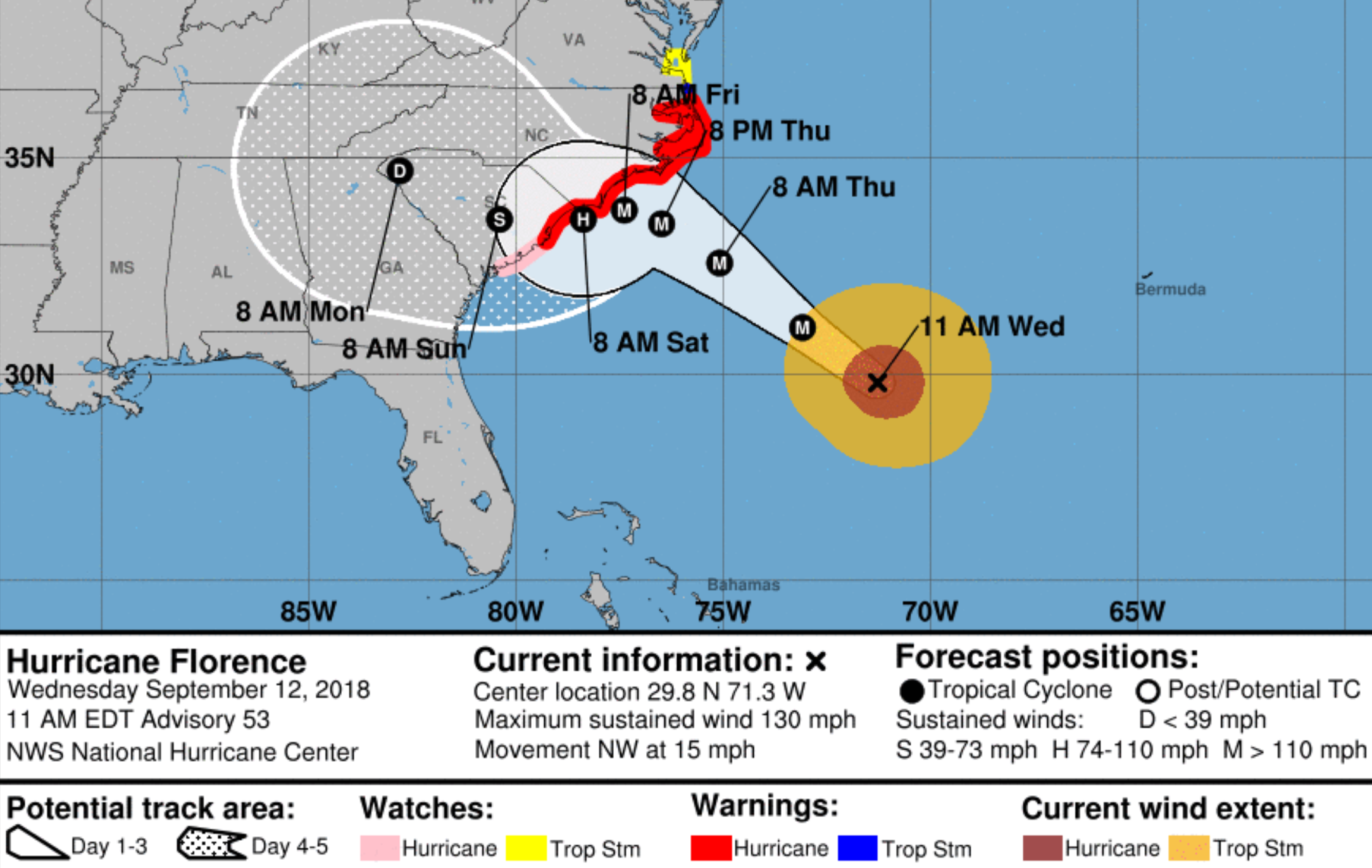 As of 11:00am Wednesday, Hurricane Florence has weakened slightly, but maintains Category 4 status with 130mph top sustained winds. The latest models show a notable southward shift and slowdown from the expected path of the last few days. Rather than stalling out over land in North Carolina, the storm is now expected to slam on the breaks before making landfall, churning off of the coast before finally meandering onshore on Saturday — rather than making landfall on Thursday as predicted a few days ago.