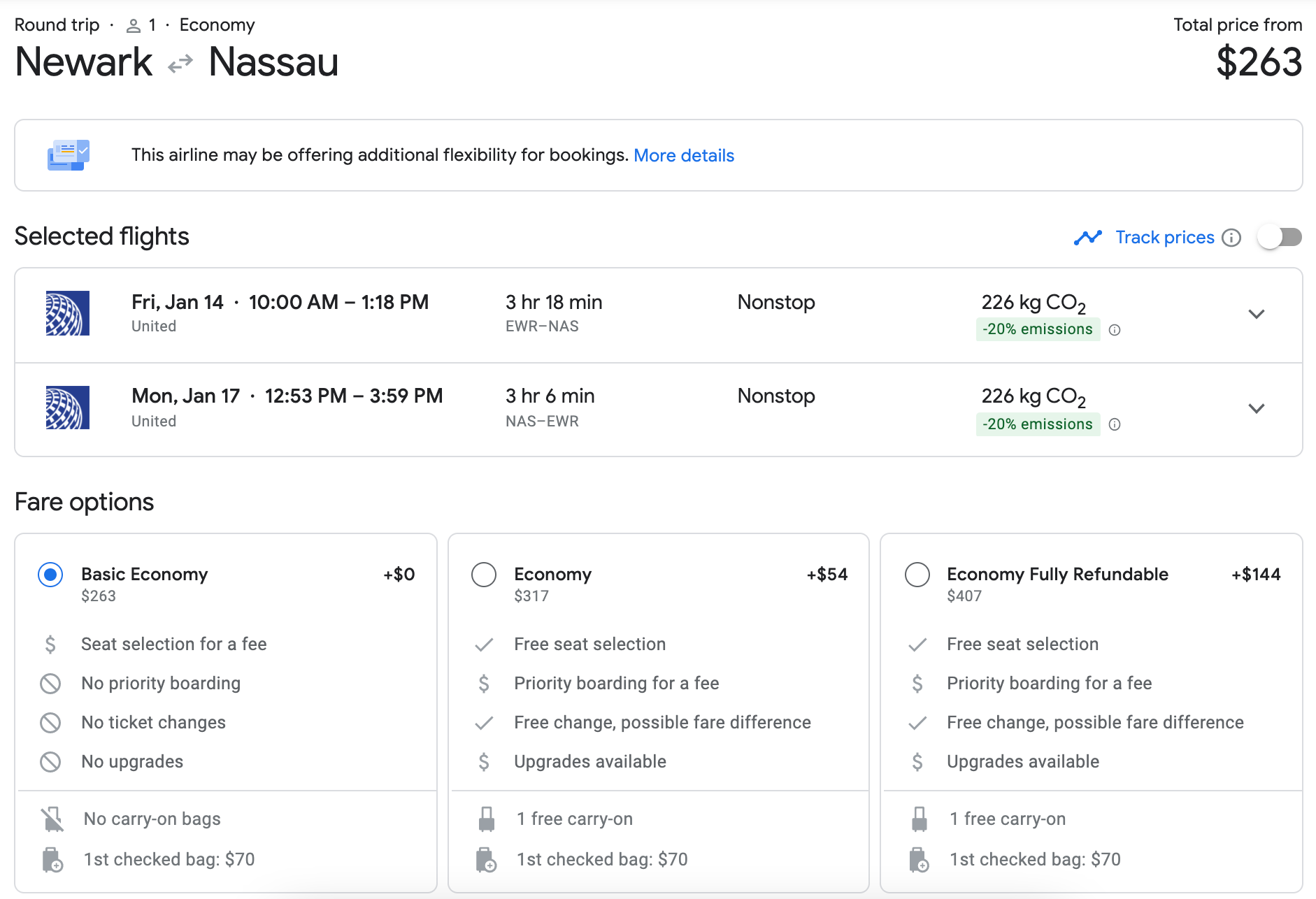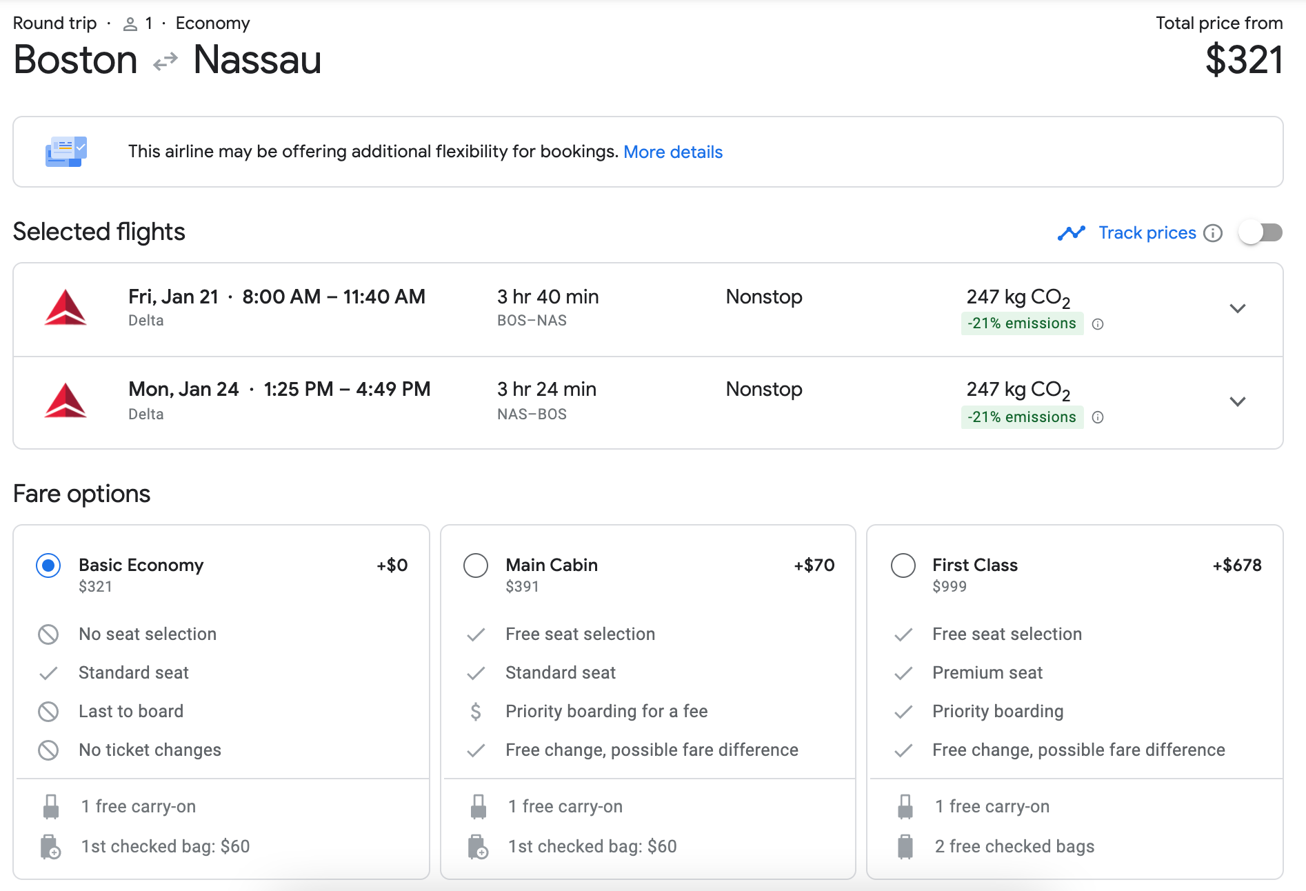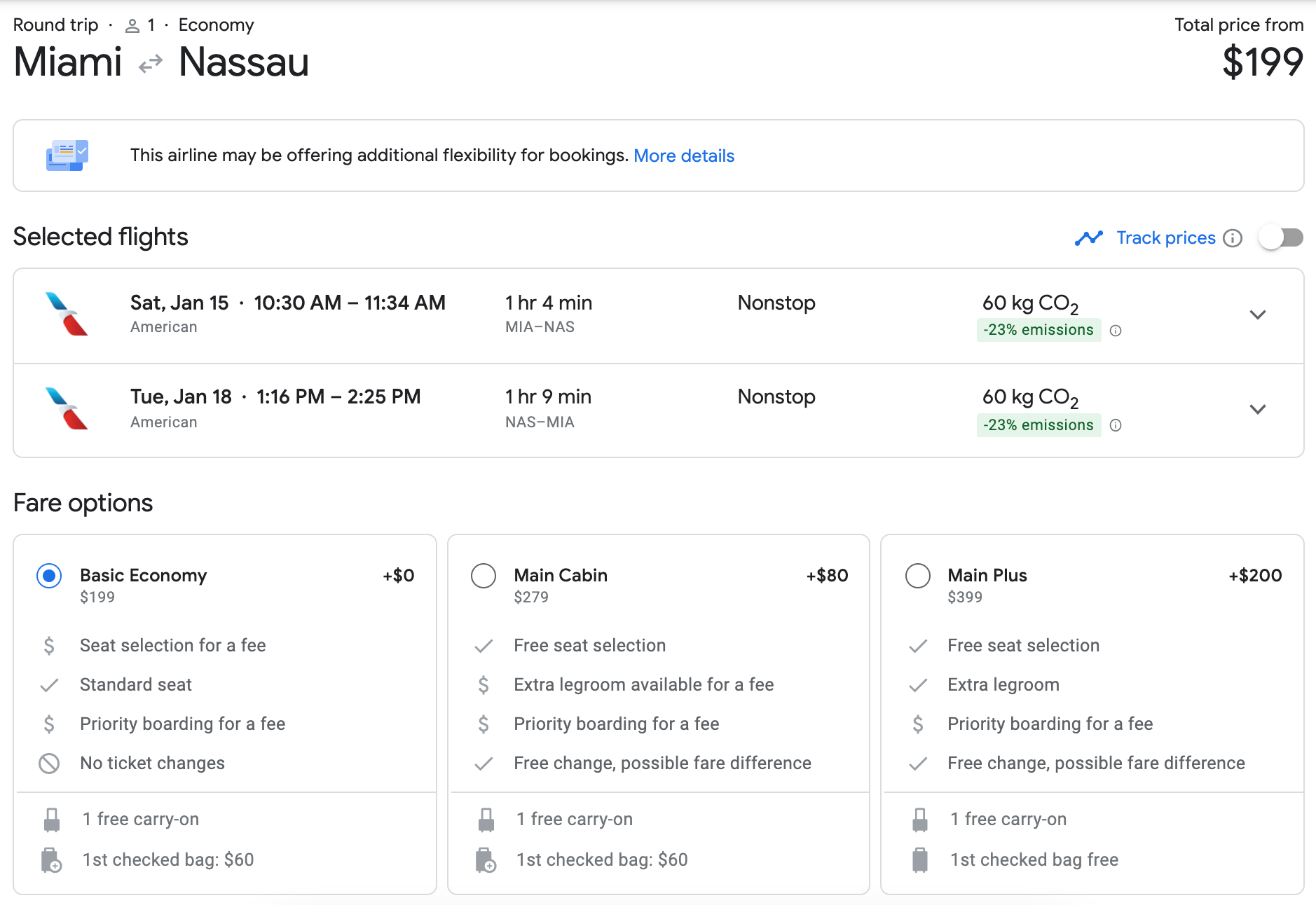 A flight you might come across is the below nonstop American flight from MIA to NAS in mid-January for less than $200 round-trip. The fare is for American Airlines' Basic Economy, which includes one free carry-on. If you wanted to choose your seat, you'd have to upgrade to their Main Cabin for $80 more.