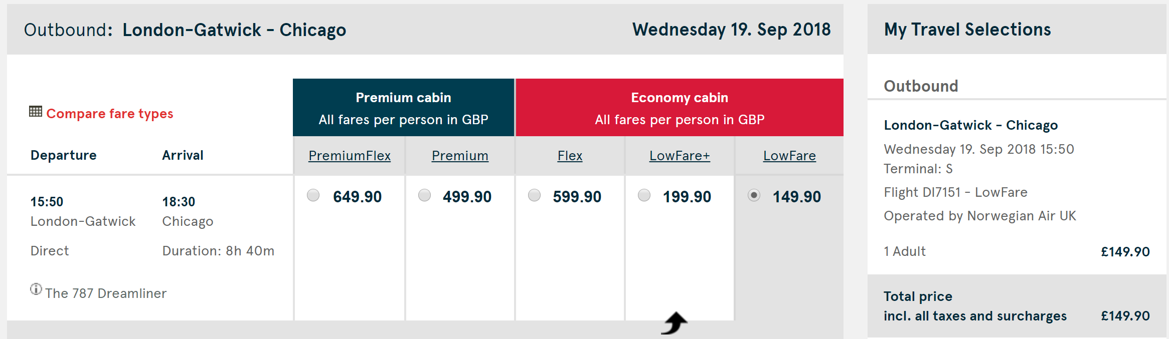 Chicago O'Hare (ORD) to London Gatwick (LGW) nonstop on Norwegian for $382 round-trip ($180 outbound, $202 return):