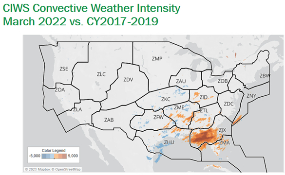 There's been a marked increase in convective weather — think thunderstorms — in northern Florida in recent years. The map below, provided by the FAA, shows a significant increase in stormy weather across the Jacksonville Center's airspace this past March, compared to previous years. That convective weather has the effect of closing down routing options for aircraft, meaning air traffic has fewer places to go, which can cause delays — especially on peak days, when a large number of flights are vying for space.