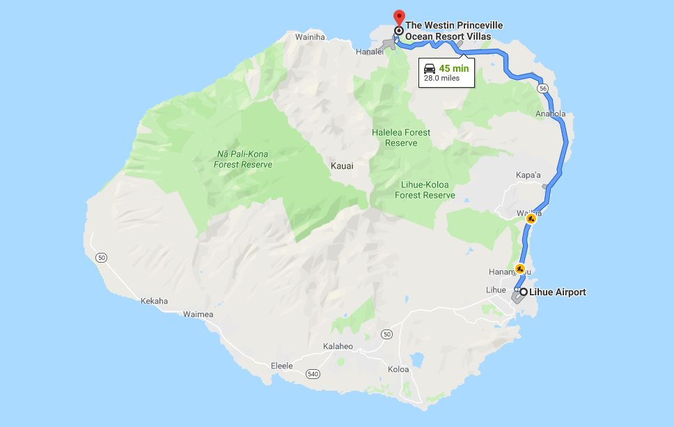 The challenge is, most visitors arrive at Lihue International Airport (LIH), and getting up to Princeville can be a bit of a pain. You'll need a rental car — which I'd recommend getting either way — and unpredictable traffic can make the 45-minute trek take far longer than predicted.