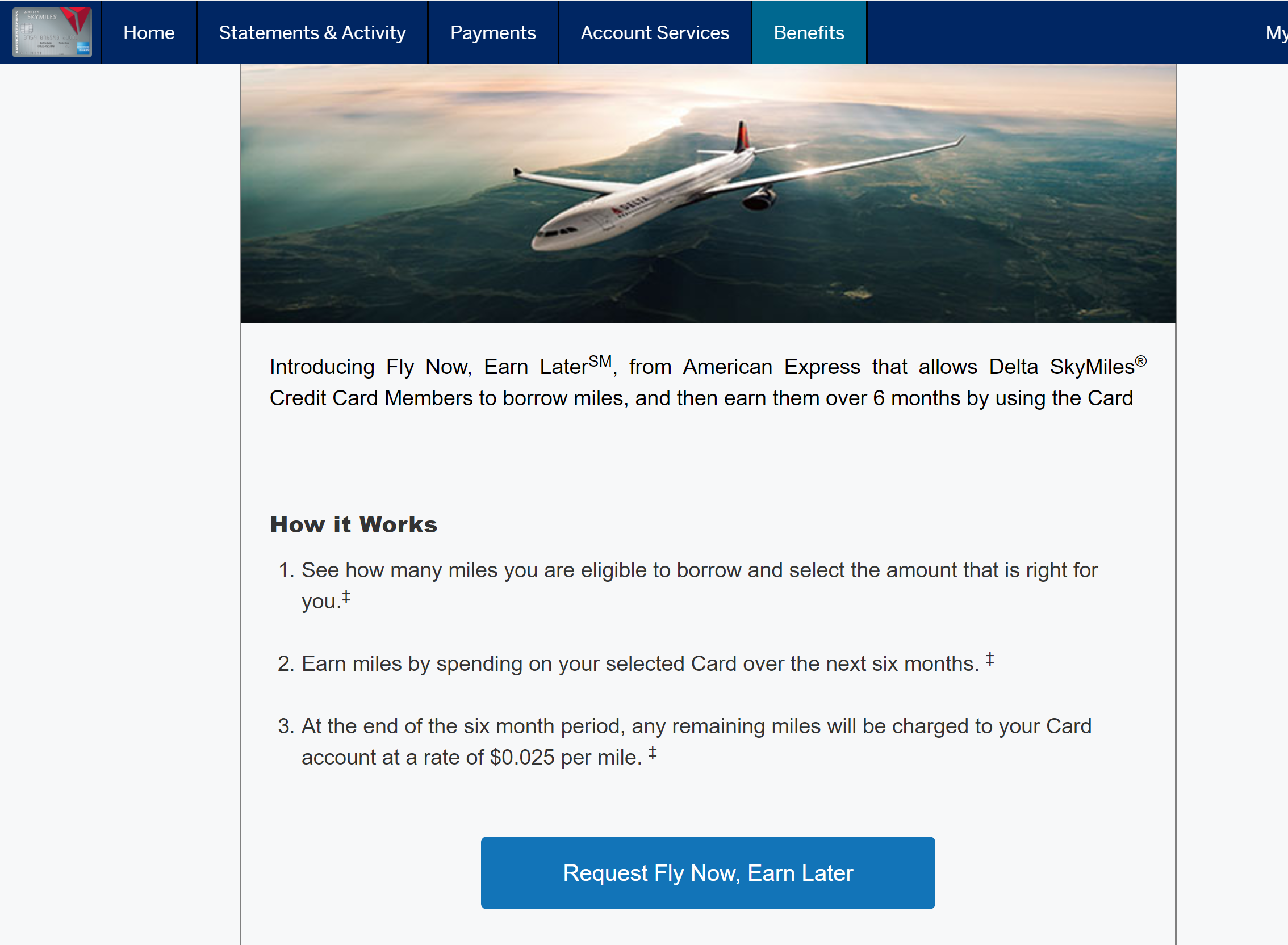 It appears that this is a targeted offer. If you have an Amex co-branded Delta card, log in to your Amex account, click on the Benefits section of the card as seen in the image above and see if you're targeted for the Fly Now, Earn Later offer. Presumably all Delta co-branded Amex cards are eligible for this offer, such as the Platinum Delta SkyMiles® Credit Card from American Express, the Gold Delta SkyMiles® Credit Card from American Express and the Delta Reserve® Card from American Express.